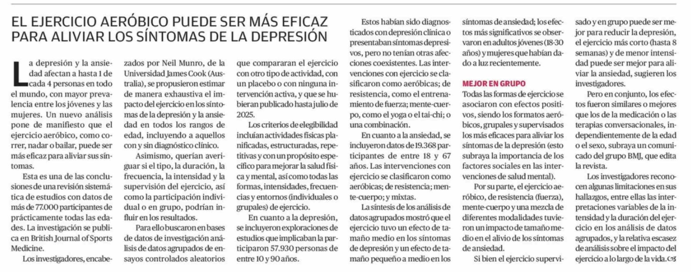 Título: EL EJERCICIO AERÓBICO PUEDE SER MÁS EFICAZ PARA ALIVIAR LOS SÍNTOMAS DE LA DEPRESIÓN