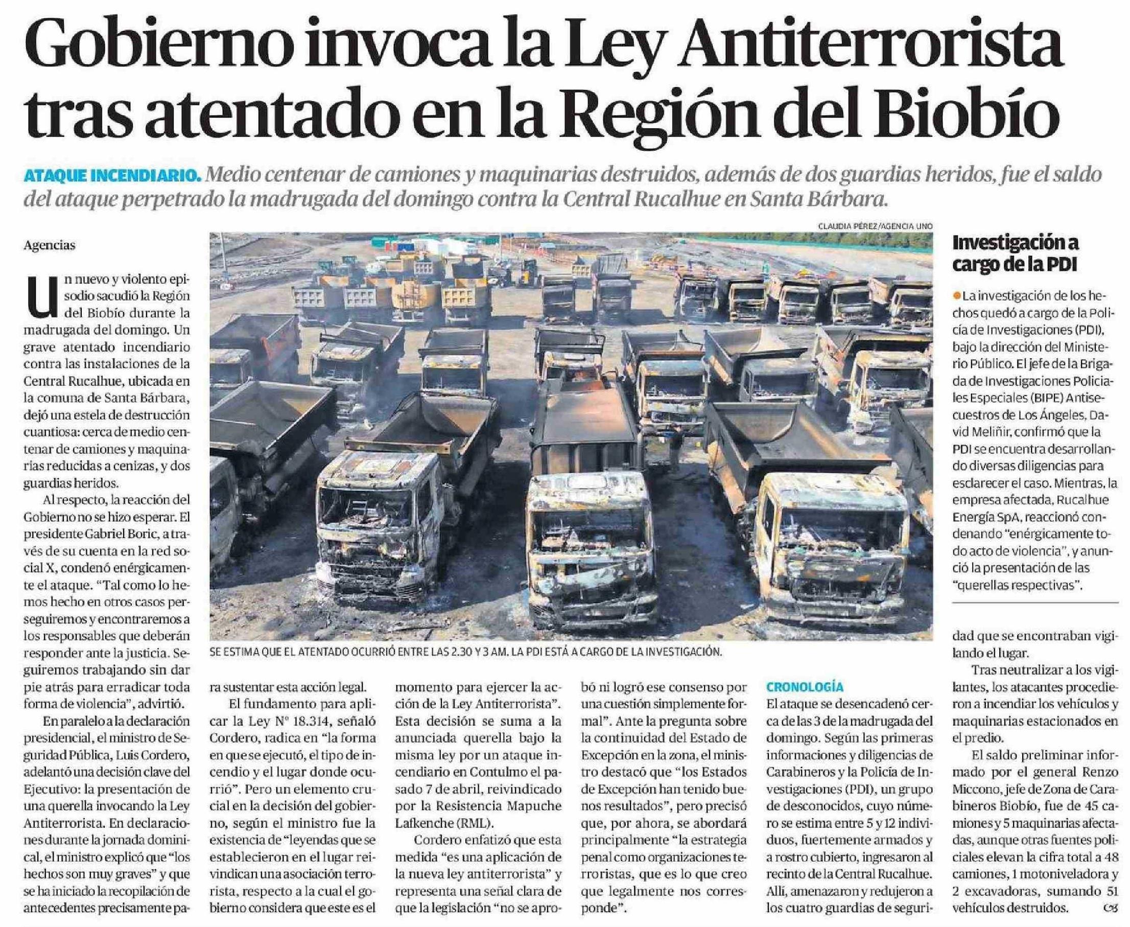 Gobierno invoca la Ley Antiterrorista tras atentado en la Región del Biobío 21-04-2025 El Mercurio de Antofagasta |