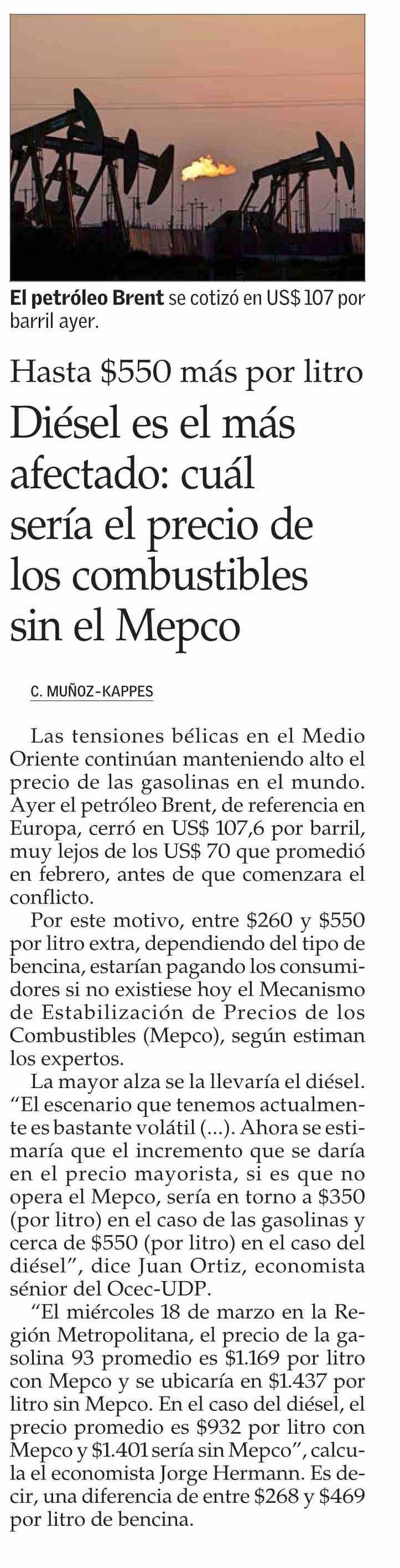 Diésel es el más afectado: cuál sería el precio de los combustibles sin el Mepco 20-03-2026 El Mercurio |