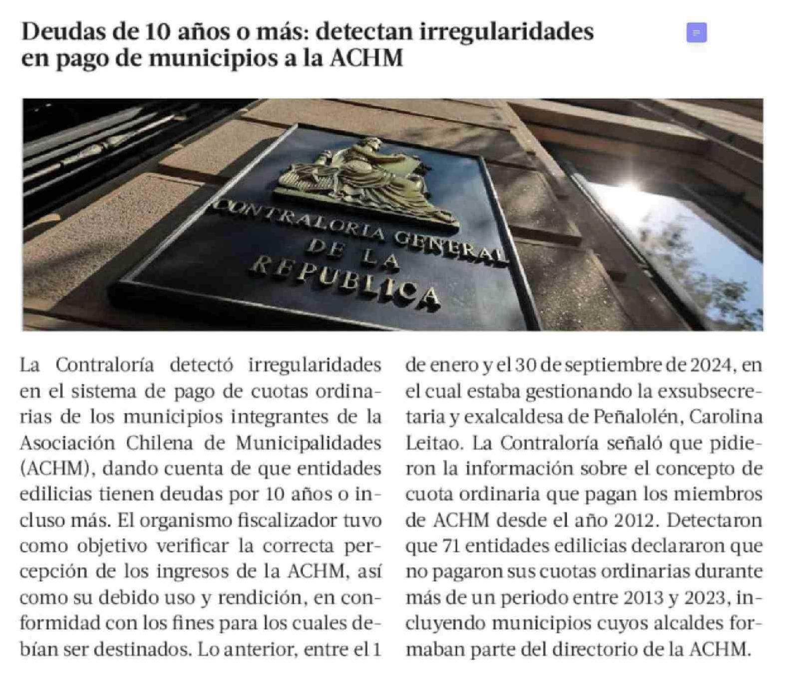 Deudas de 10 años o más: detectan irregularidades en pago de municipios a la ACHM 02-04-2026 La Tercera |