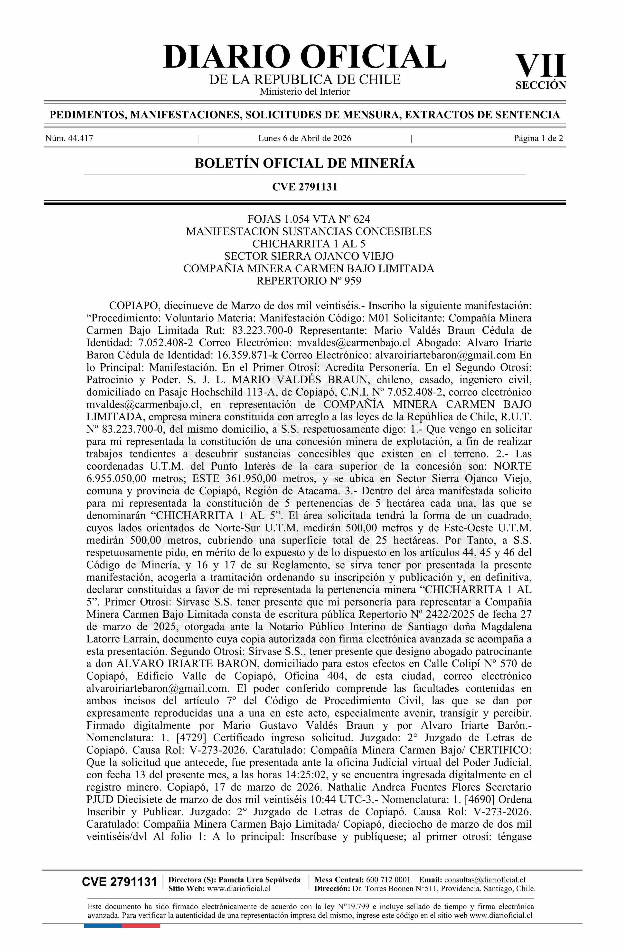 Fuente: DIARIO OFICIAL CHILE - BOLETÍN OFICIAL DE MINERÍA (DIARIO OFICIAL CHILE – BOM – MANIFESTACIONES MIN) Página(s): 5-6