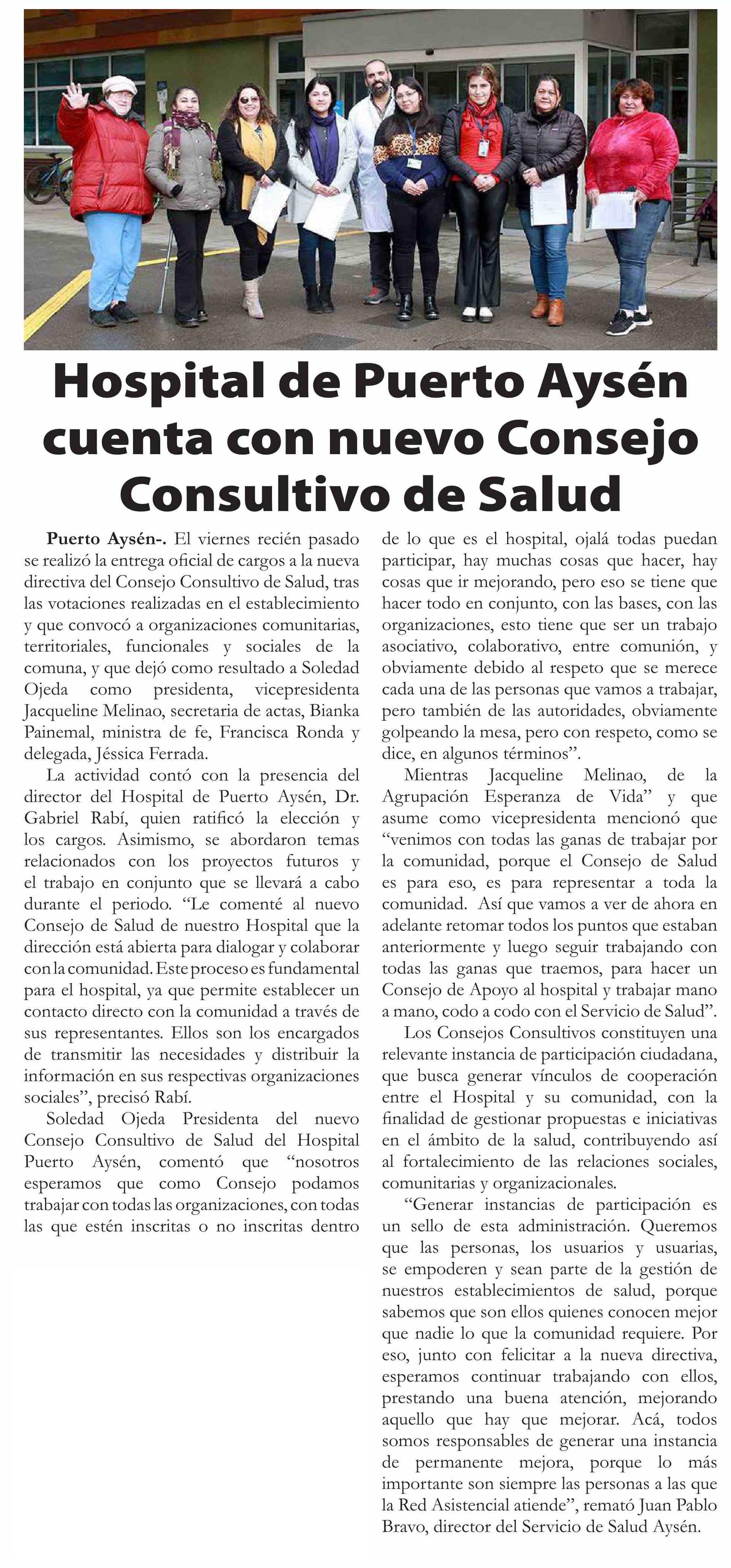 Hospital de Puerto Aysén cuenta con nuevo Consejo Consultivo de Salud 05-07-2024 El Divisadero |