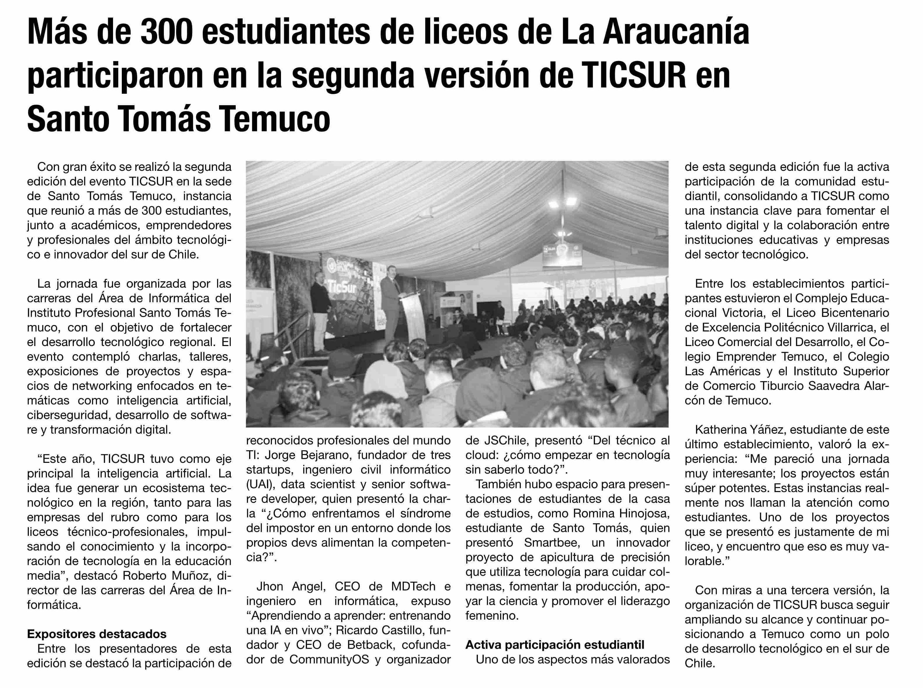 Más de 300 estudiantes de liceos de La Araucanía participaron en la segunda versión de TICSUR en Santo Tomás Temuco 03-06-2025 El Informador |