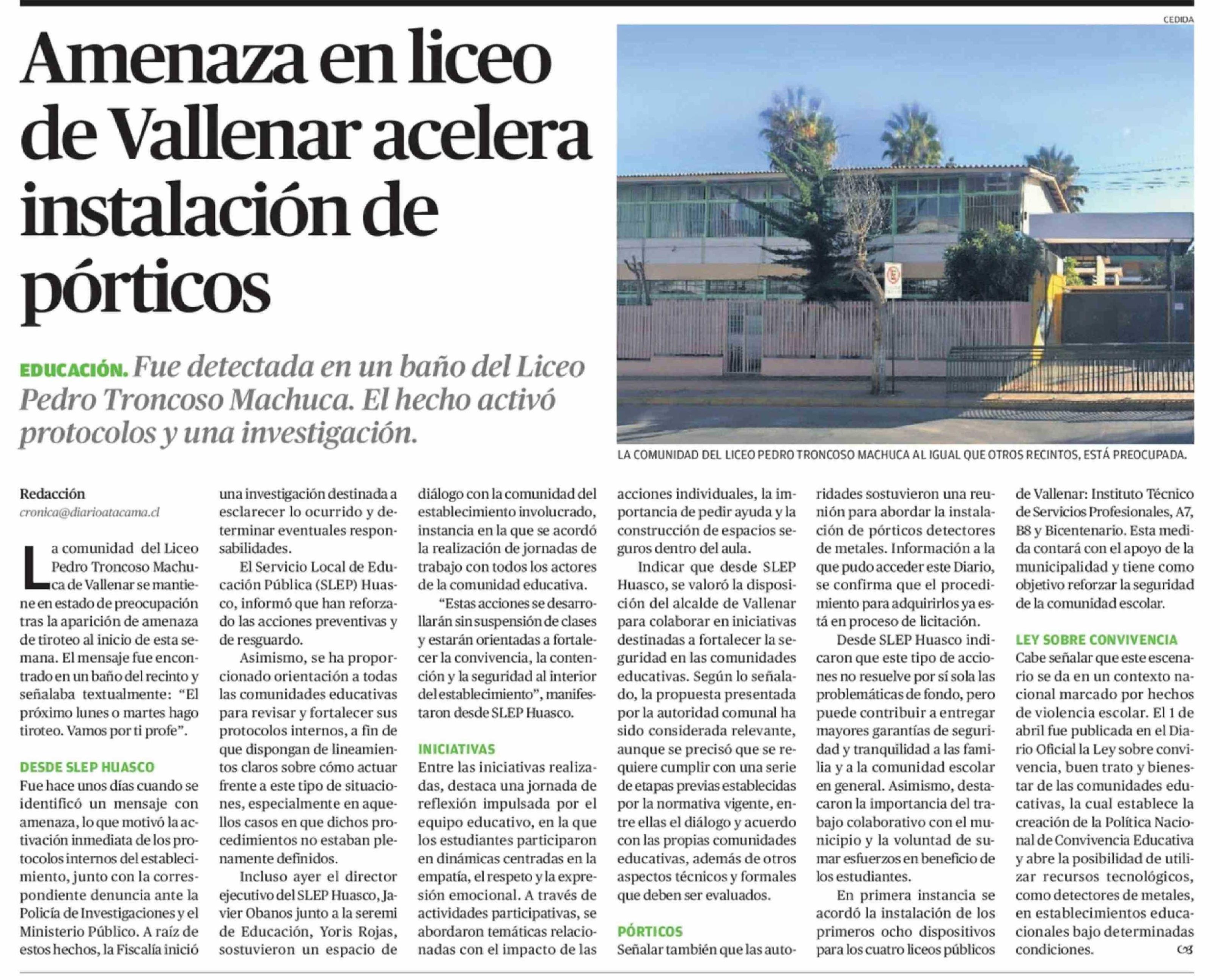 | Título: | Amenaza en liceo de Vallenar acelera instalación de pórticos |