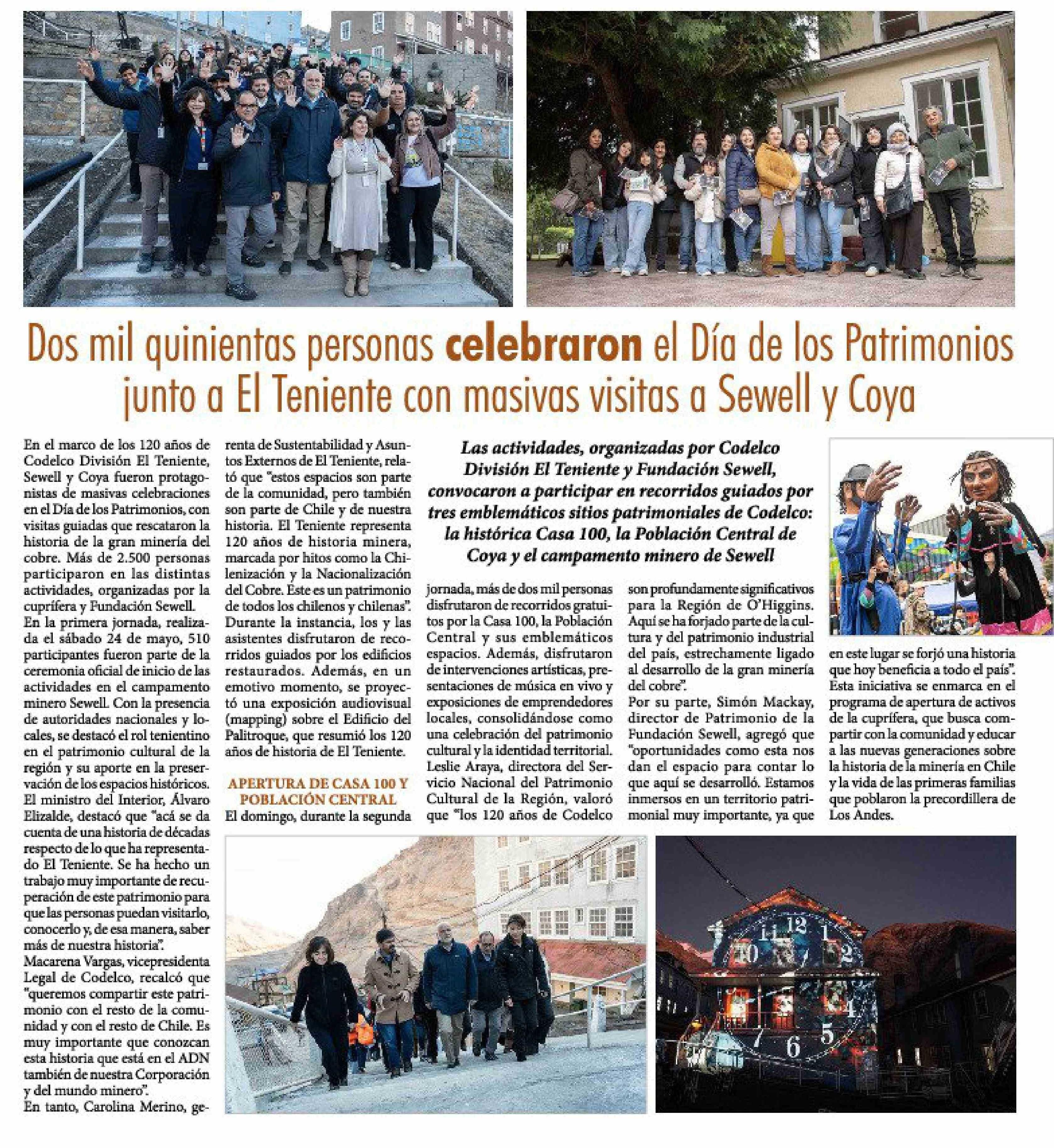 Dos mil quinientas personas celebraron el Día de los Patrimonios junto a El Teniente con masivas visitas a Sewell y Coya 27-05-2025 El Rancagüino |