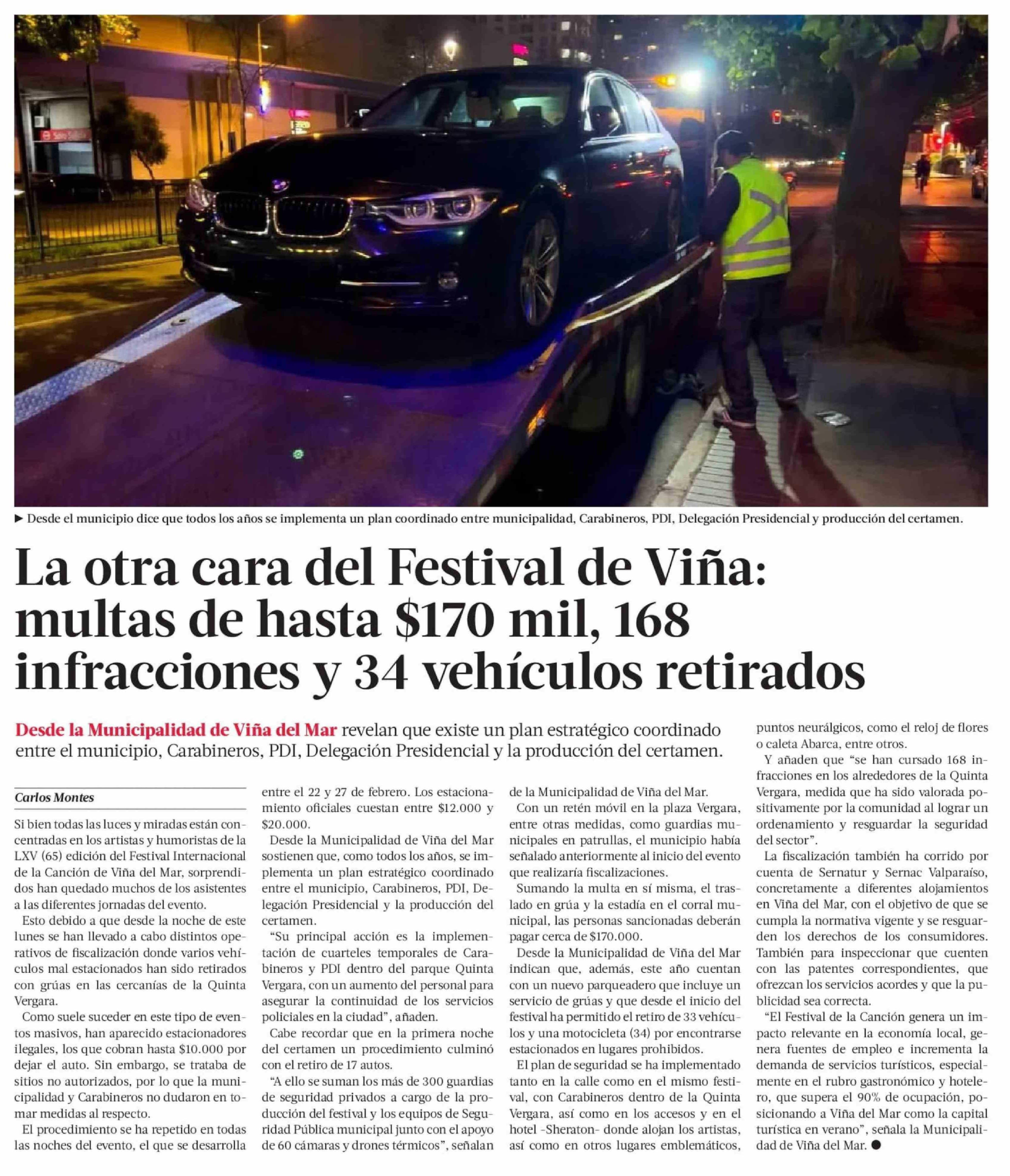 La otra cara del Festival de Viña: multas de hasta $170 mil, 168 infracciones y 34 vehículos retirados 27-02-2026 La Tercera |