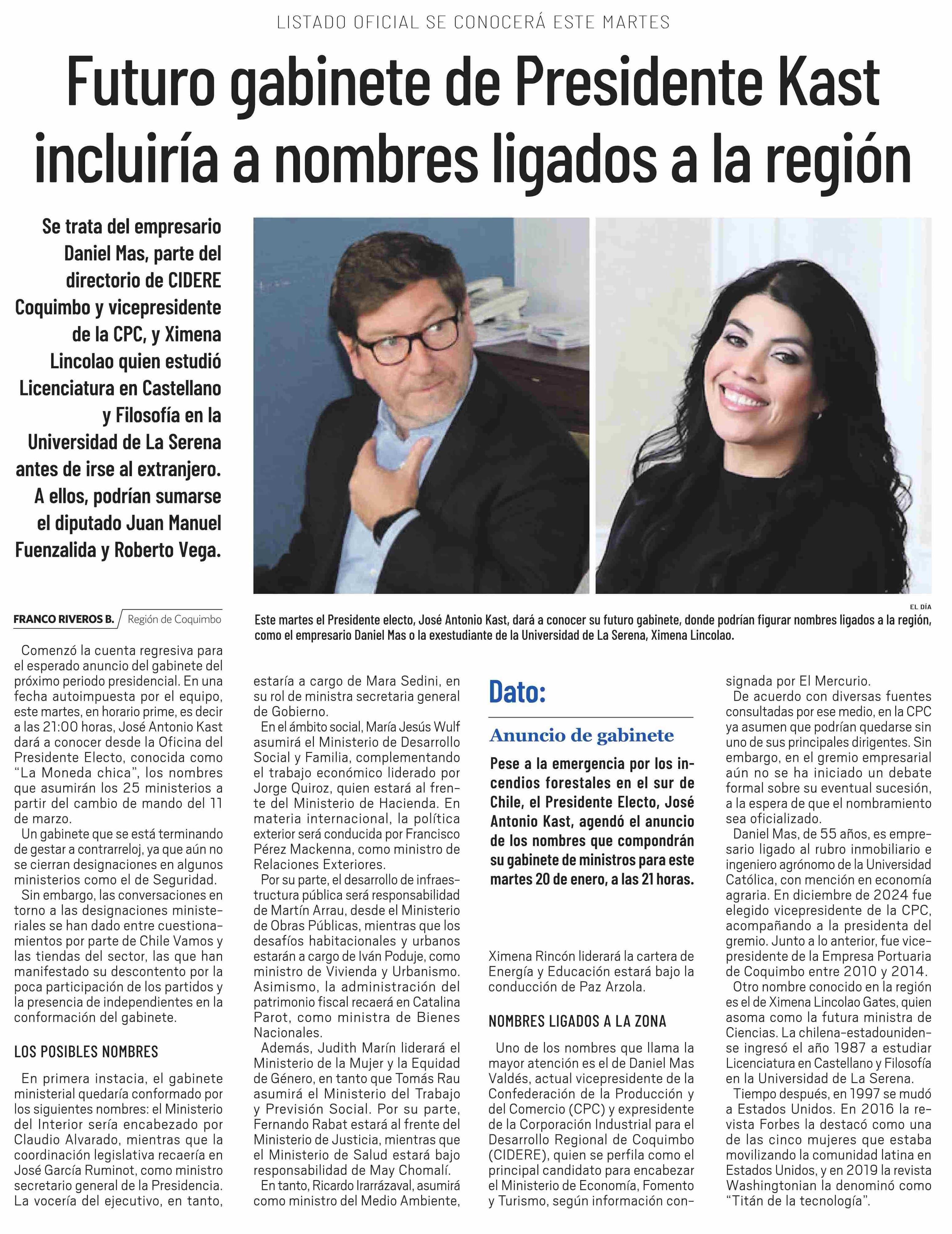 Título: Futuro gabinete de Presidente Kast incluiría a nombres ligados a la región