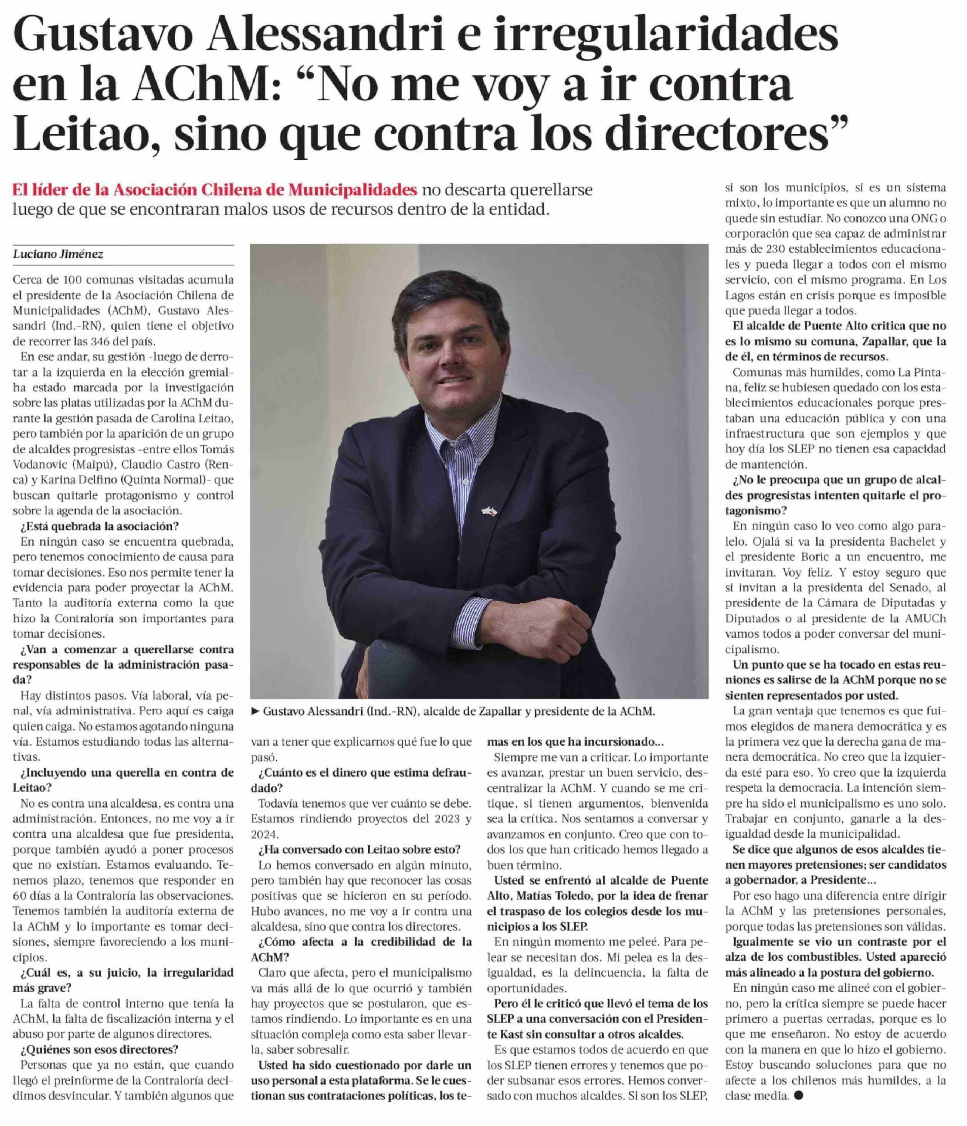 Gustavo Alessandri e irregularidades en la AChM: "No me voy a ir contra Leitao, sino que contra los directores" 15-04-2026 La Tercera |
