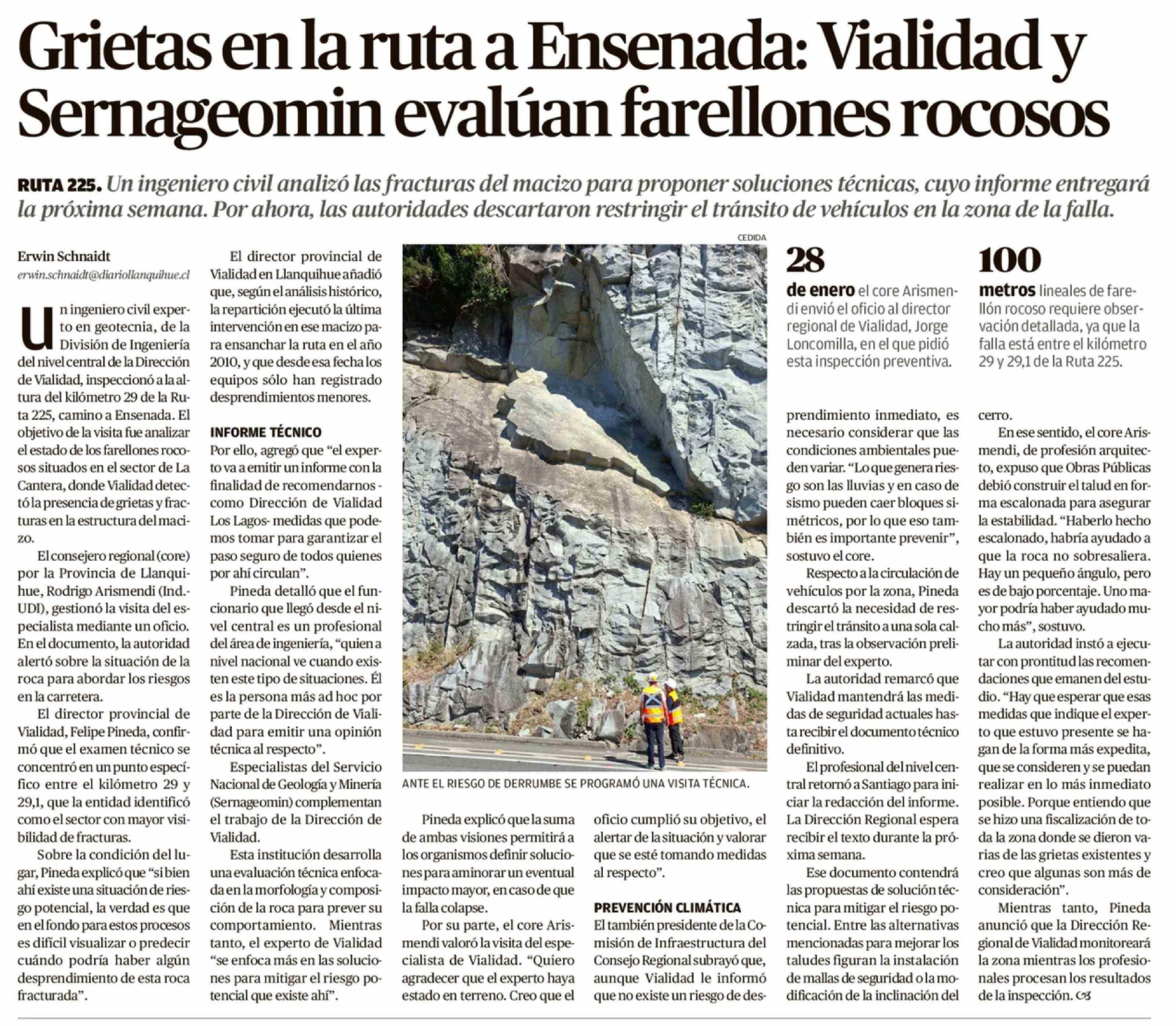 Grietas en la ruta a Ensenada: Vialidad y Sernageomin evalúan farellones rocosos 28-02-2026 El Llanquihue |