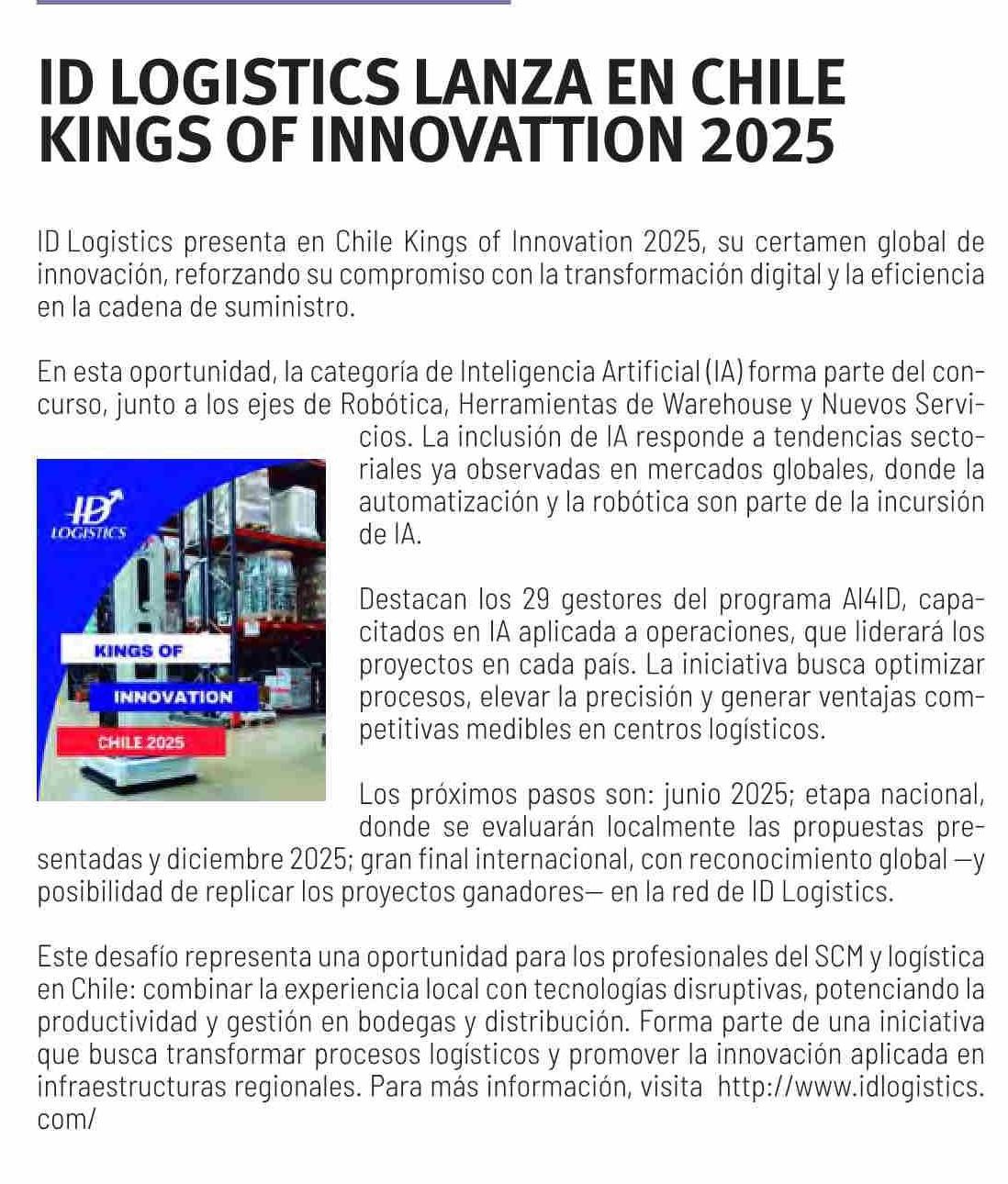 ID LOGISTICS LANZA EN CHILE KINGS OF INNOVATTION 2025 17-06-2025 Revista Logistec |
