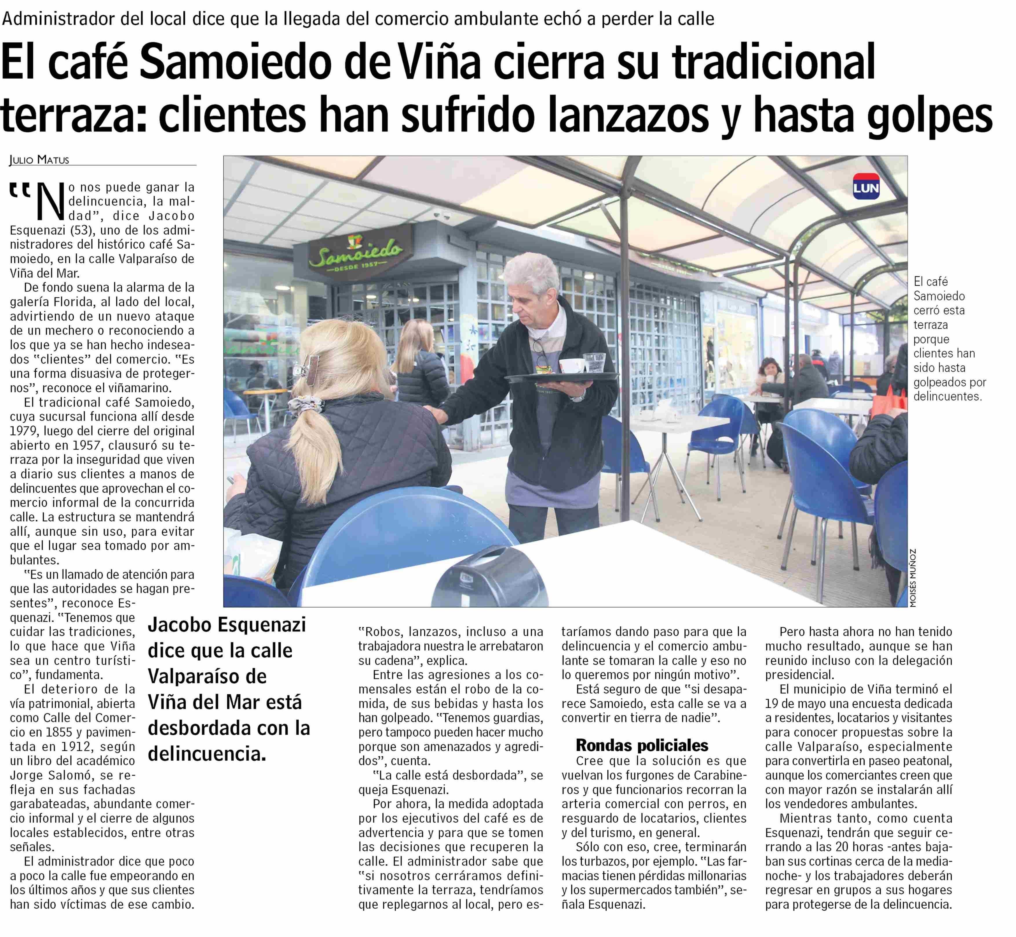 El café Samoiedo de Viña cierra su tradicional terraza: clientes han sufrido lanzazos y hasta golpes 06-06-2025 Las Últimas Noticias |
