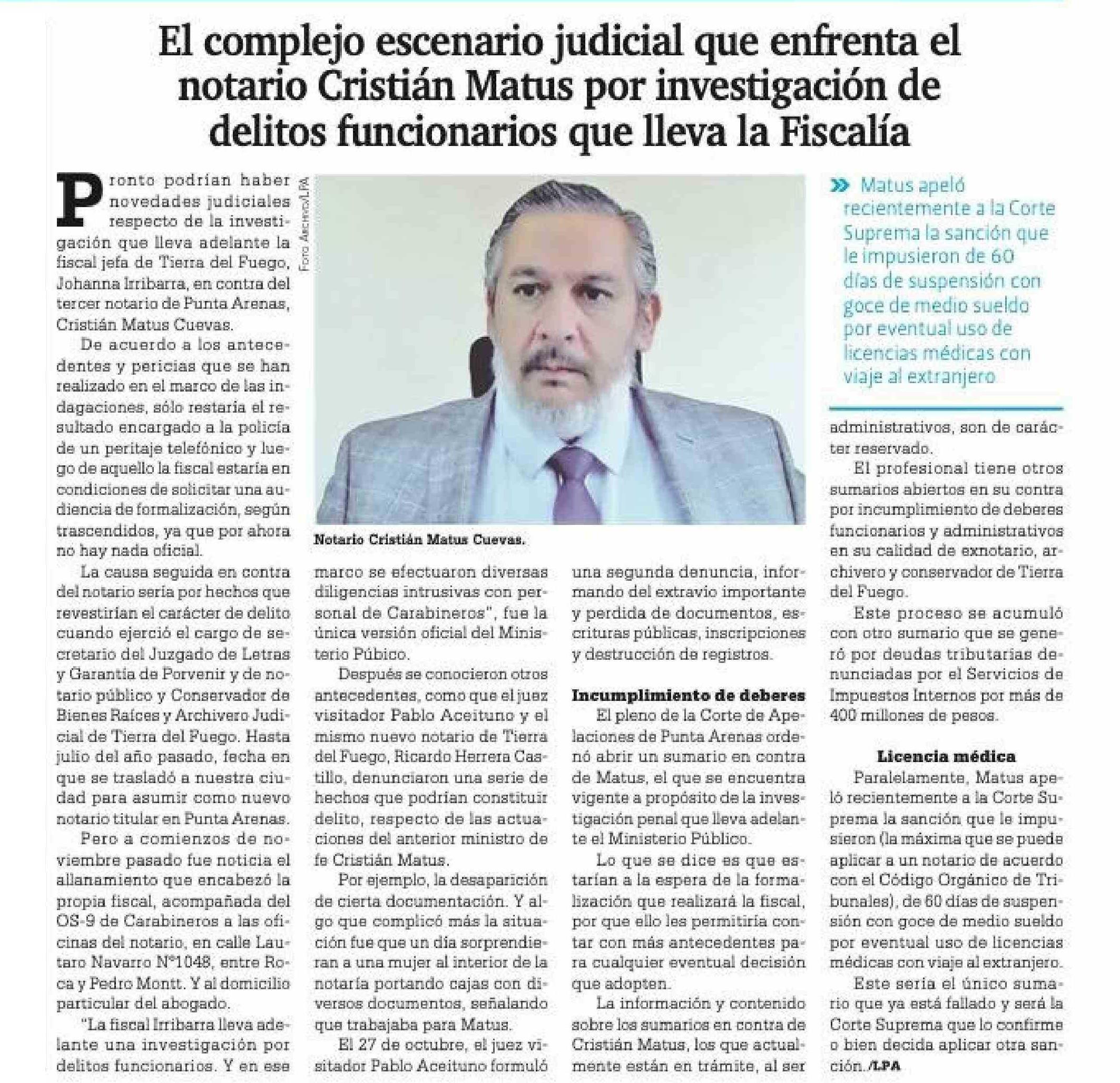 El complejo escenario judicial que enfrenta el notario Cristián Matus por investigación de delitos funcionarios que lleva la Fiscalía 16-02-2026 La Prensa Austral |
