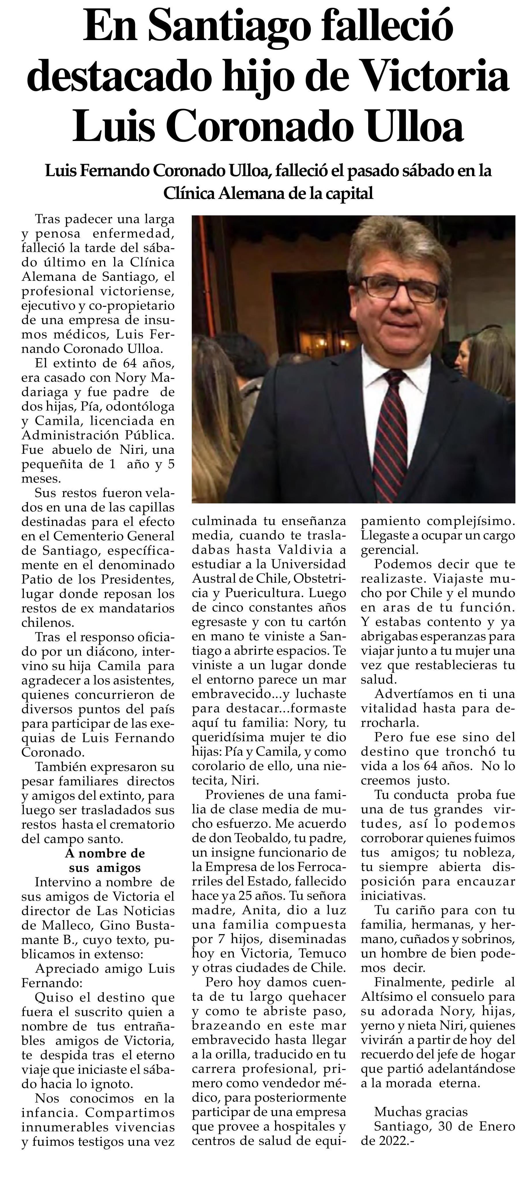 En Santiago falleció destacado hijo de Victoria Luis Coronado Ulloa 01-02-2023 Las Noticias |