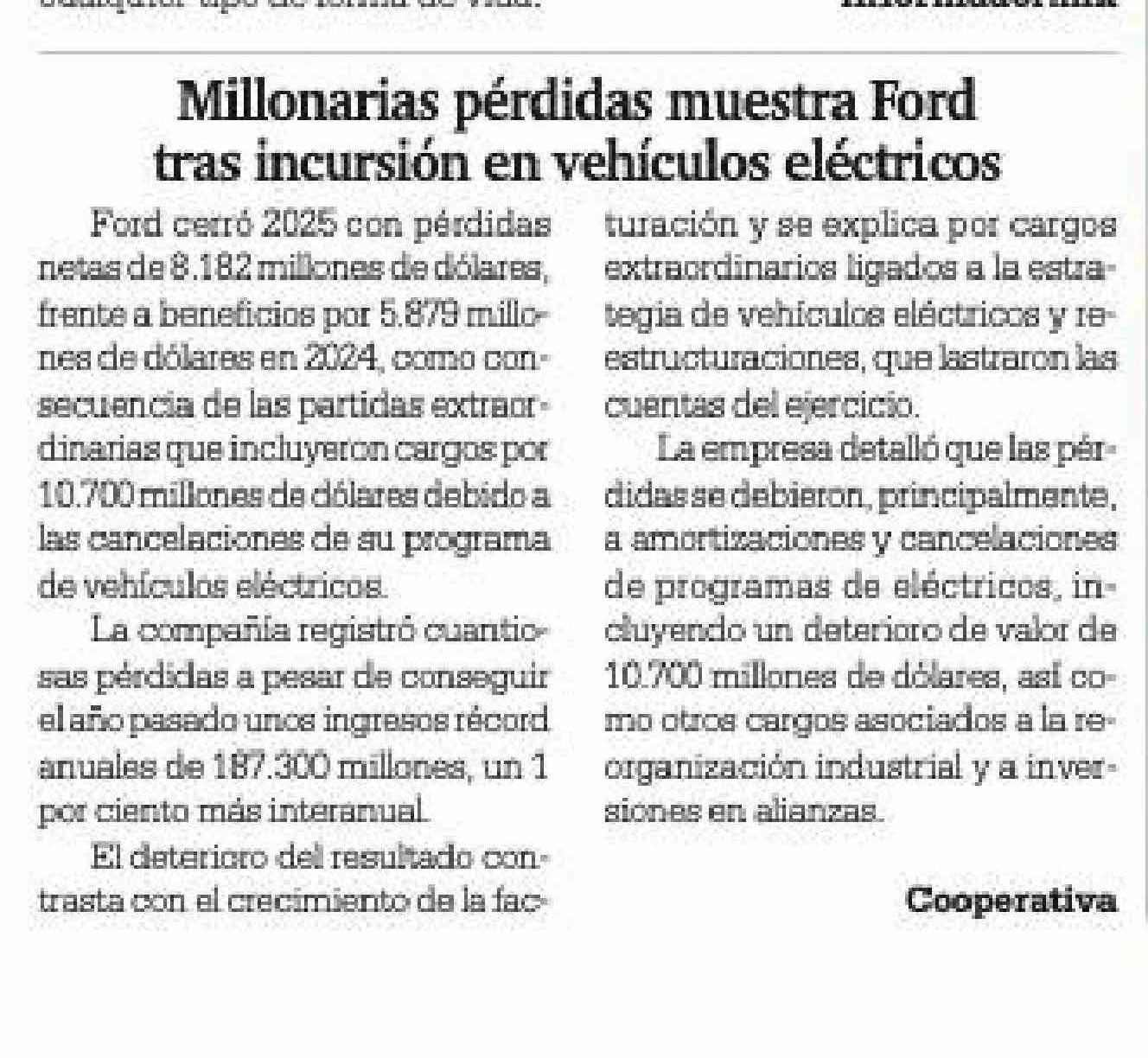 Cualquier tipo de forma de vida. Millonarias pérdidas muestra Ford 12-02-2026 La Prensa Austral |