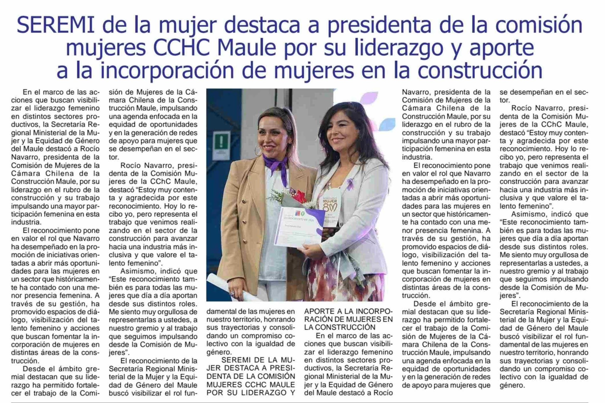 Título: SEREMI de la mujer destaca a presidenta de la comisión mujeres CCHC Maule por su liderazgo y aporte a la incorporación de mujeres en la construcción