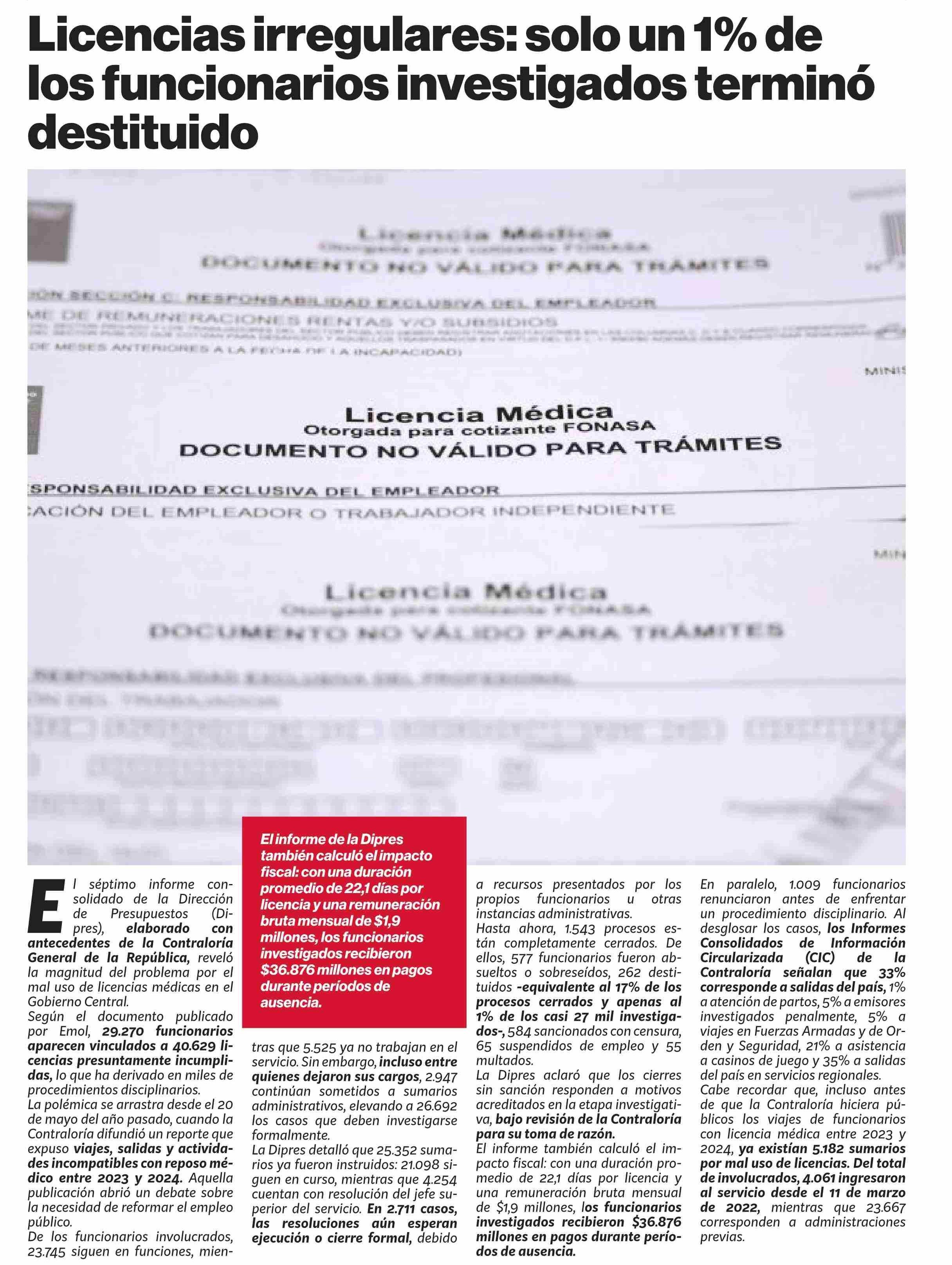 Licencias irregulares: solo un 1% de los funcionarios investigados termino destituido 05-02-2026 Puranoticia.cl |