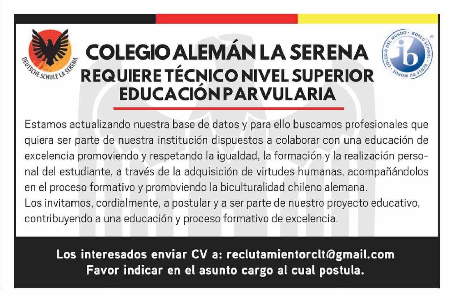 COLEGIO ALEMÁN LA SERENA REQUIERE TÉCNICO NIVEL SUPERIOR EDUCACIÓN PARVULARIA 07-03-2026 El Día |