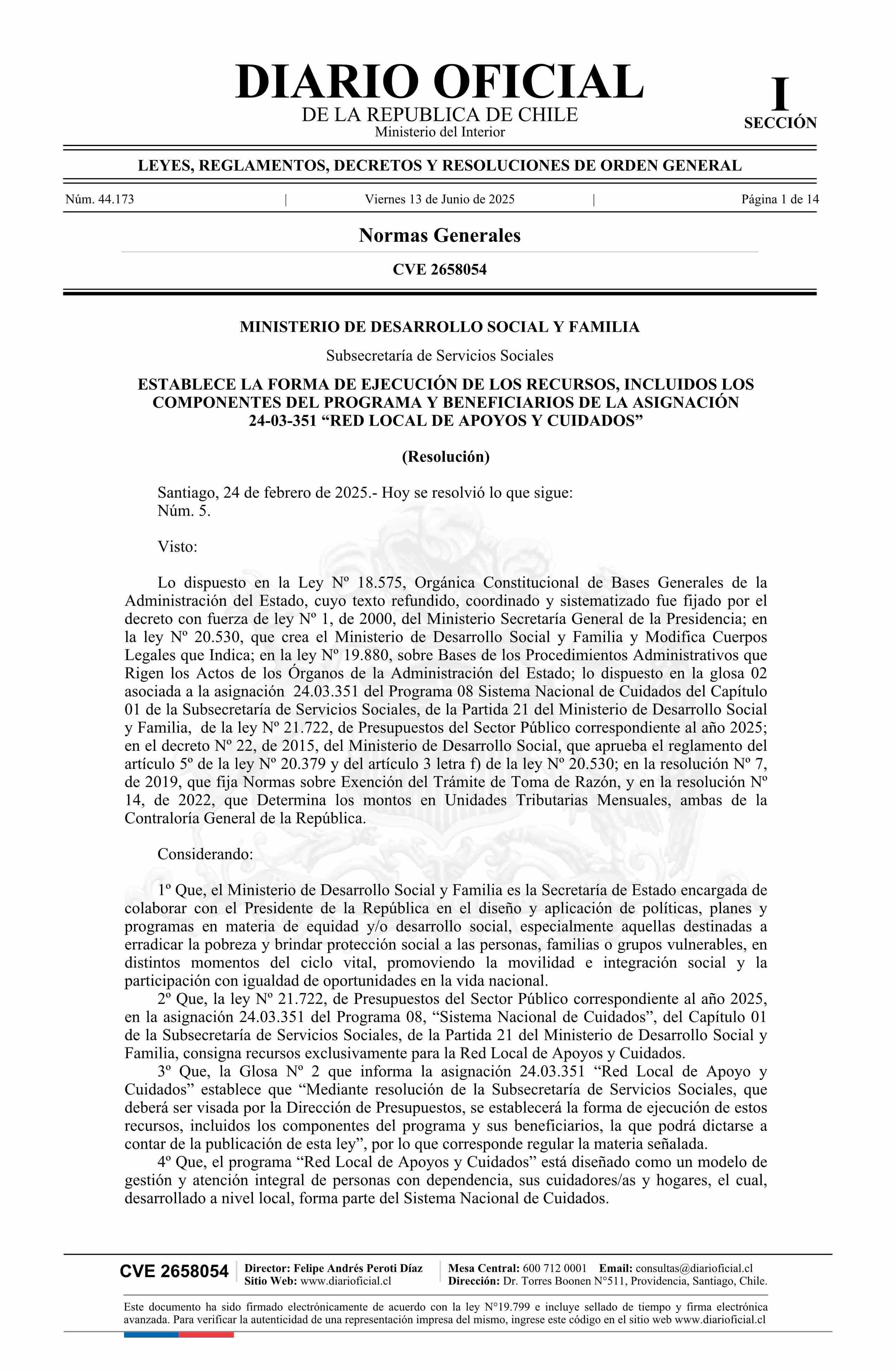 Título: Resolución número 5, de 2025.- Establece la forma de ejecución de los recursos, incluidos los componentes del programa y beneficiarios de la Asignación 24-03-351 Red Local de Apoyos y Cuidados