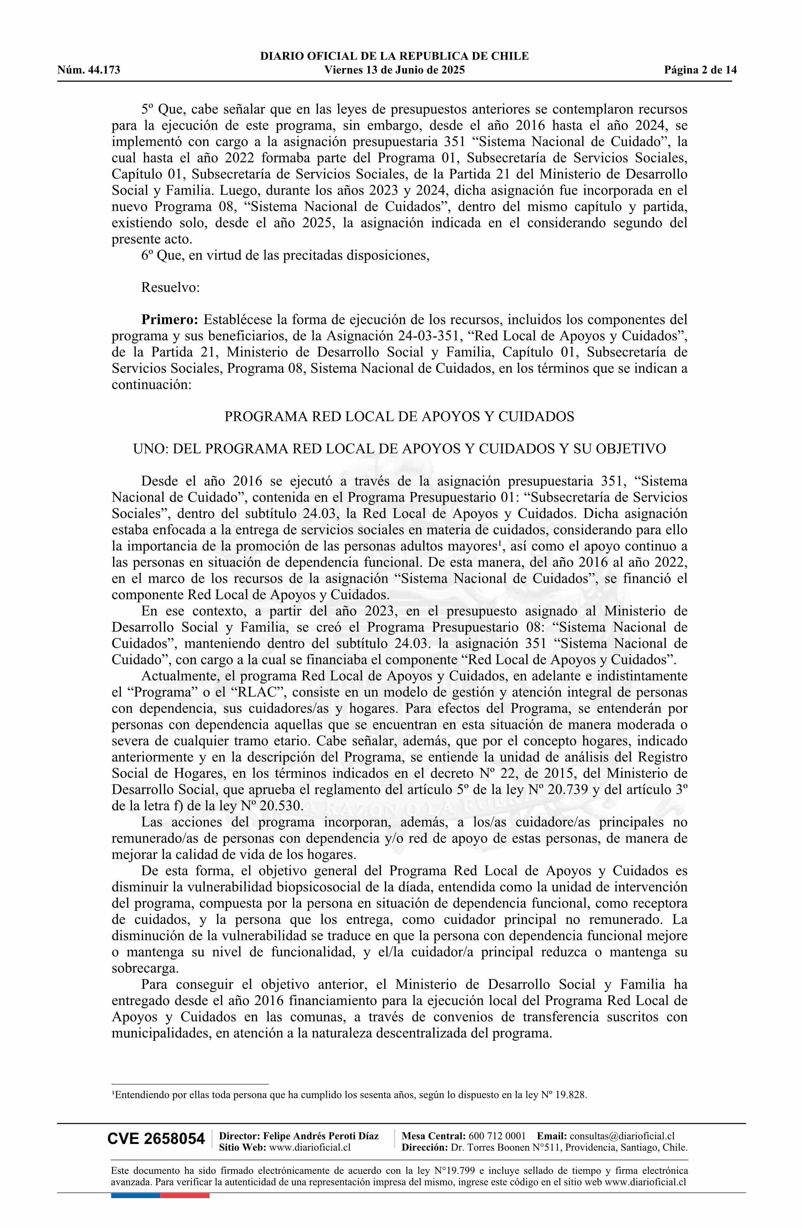 Resolución número 5, de 2025.- Establece la forma de ejecución de los recursos, incluidos los componentes del programa y beneficiarios de la Asignación 24-03-351 Red Local de Apoyos y Cuidados