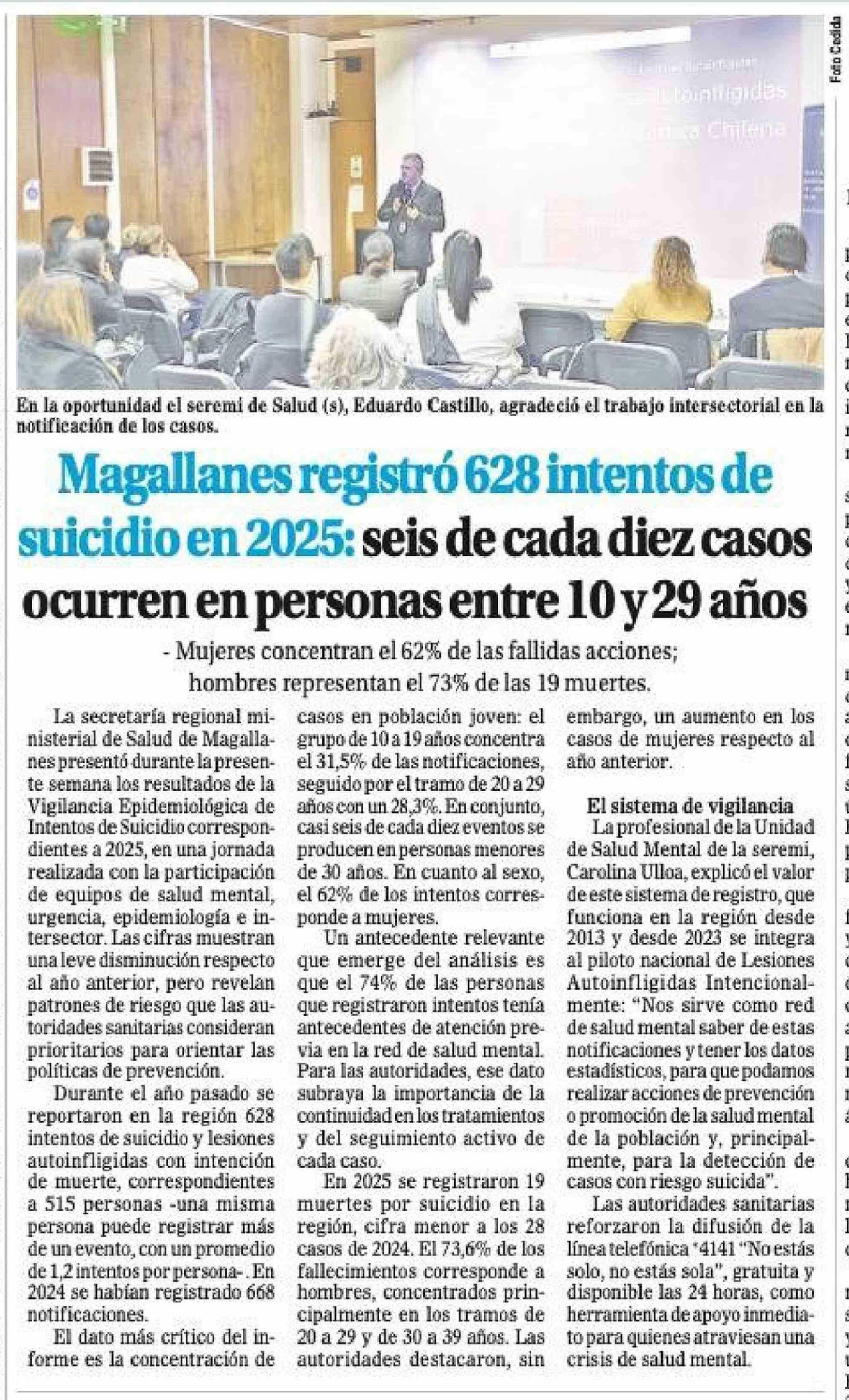 | Título: | Magallanes registró 628 intentos de suicidio en 2025: seis de cada diez casos ocurren en personas entre 10 y 29 años |