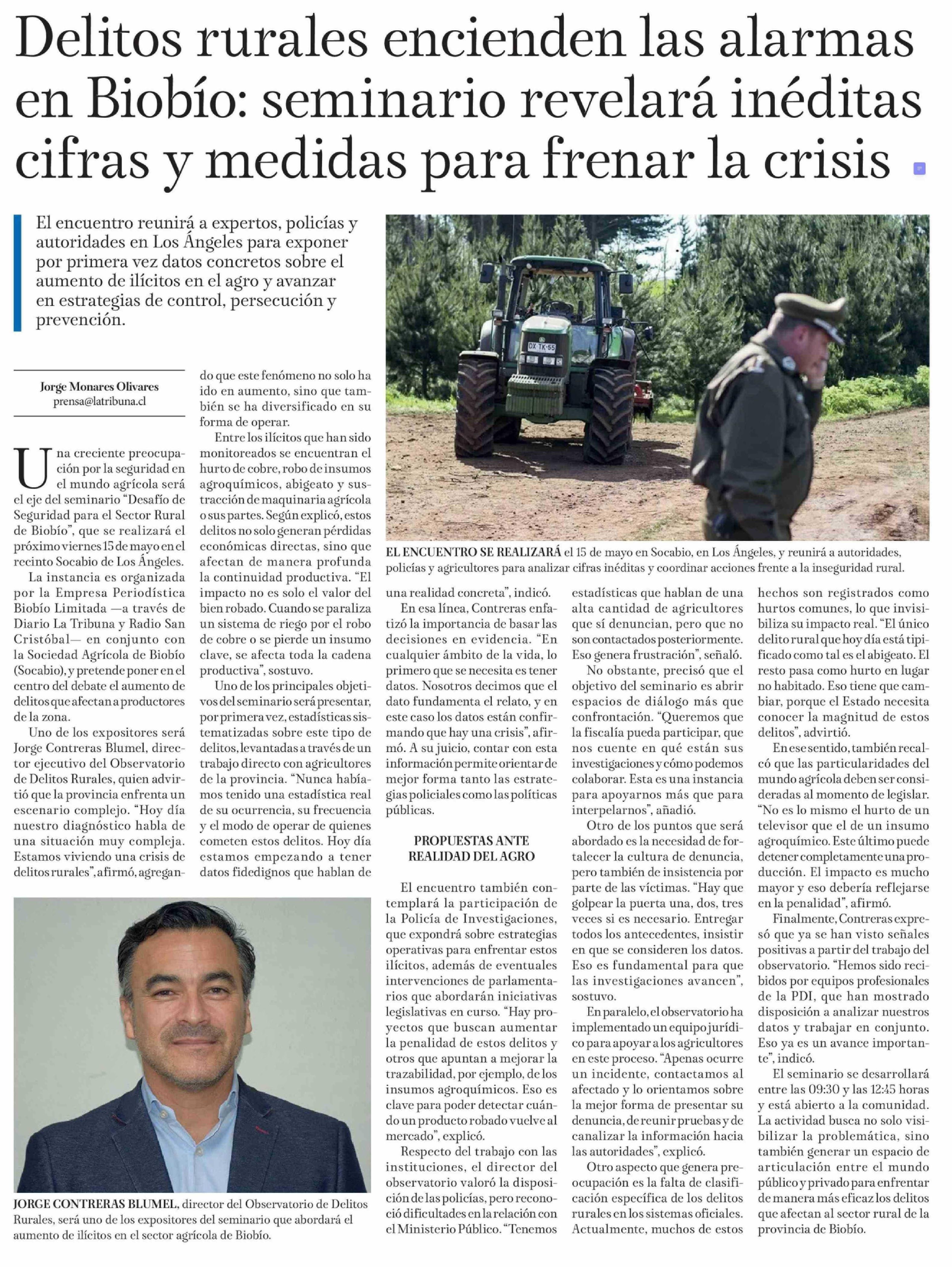 Delitos rurales encienden las alarmas en Biobío: seminario revelará inéditas cifras y medidas para frenar la crisis 23-04-2026 La Tribuna |