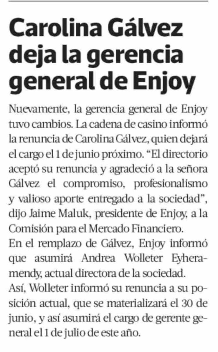 | Título: | Carolina Gálvez deja la gerencia general de Enjoy |