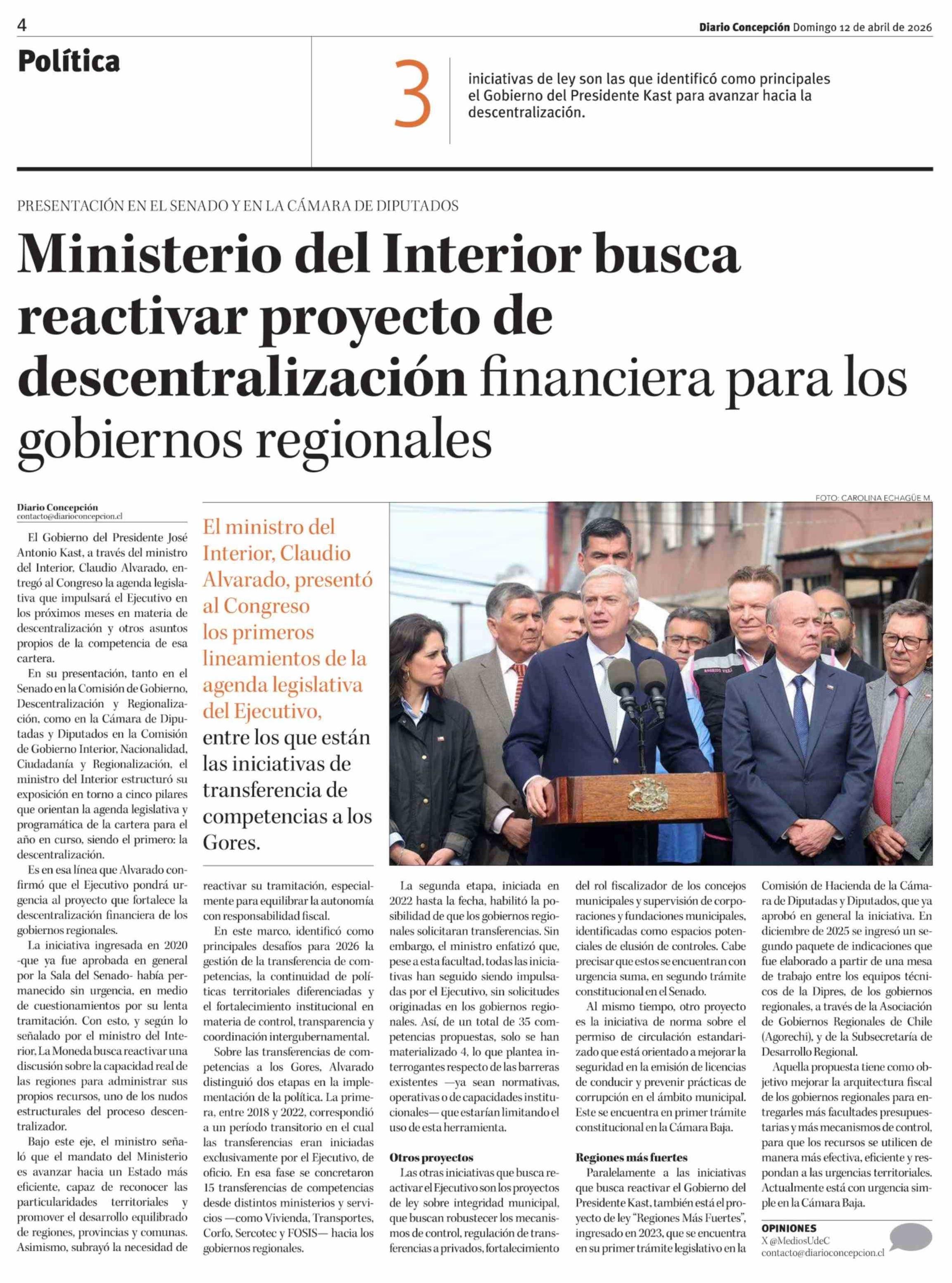 Ministerio del Interior busca reactivar proyecto de descentralización financiera para los gobiernos regionales 12-04-2026 Diario Concepción |