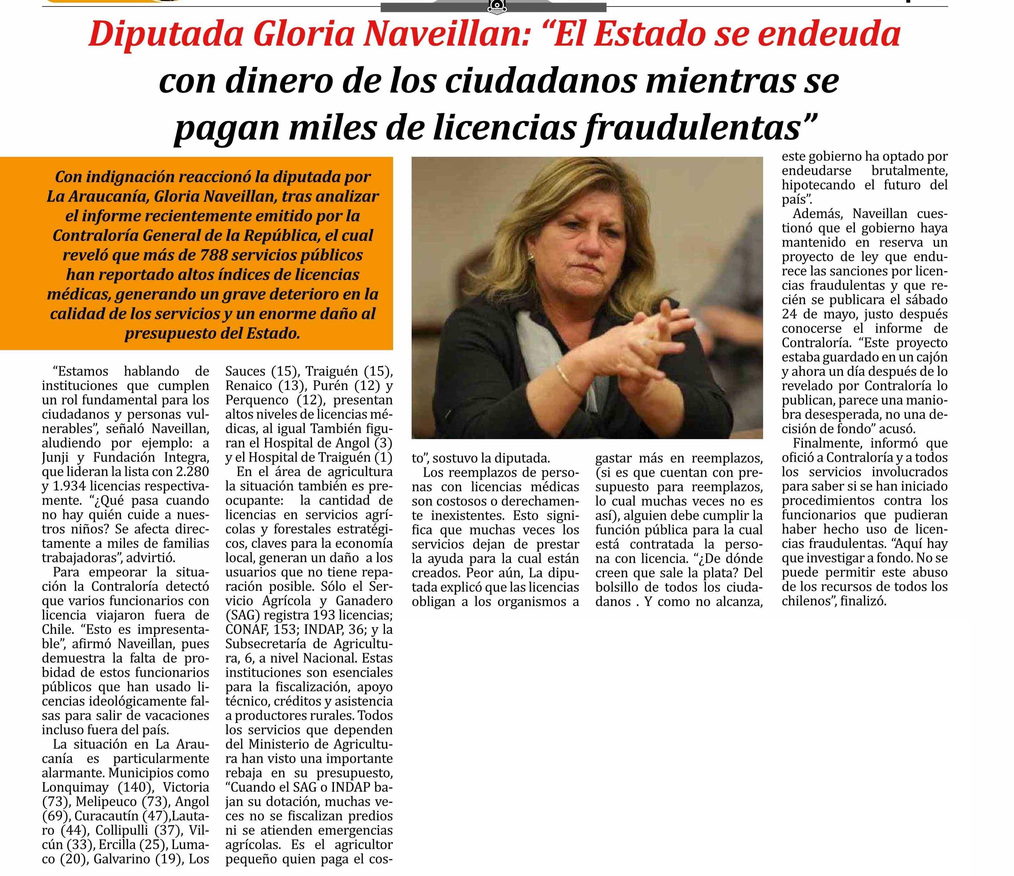 Título: Diputada Gloria Naveillan: “El Estado se endeuda con dinero de los ciudadanos mientras se pagan miles de licencias fraudulentas”