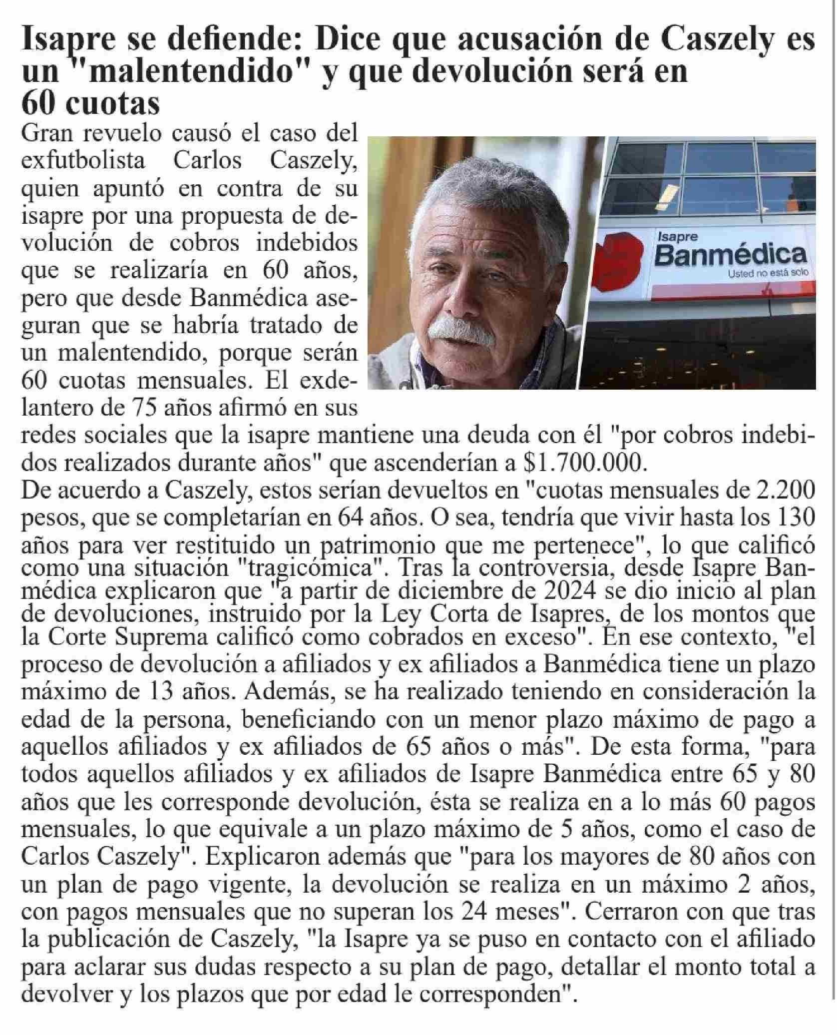 Título: Isapre se defiende: Dice que acusación de Caszely es un "malentendido" y que devolución será en 60 cuotas
