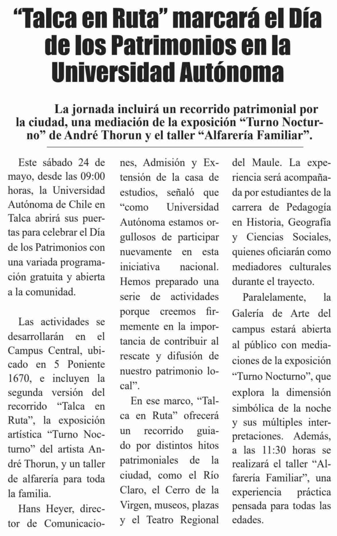 “Talca en Ruta” marcará el Día de los Patrimonios en la Universidad Autónoma 24-05-2025 El Heraldo |