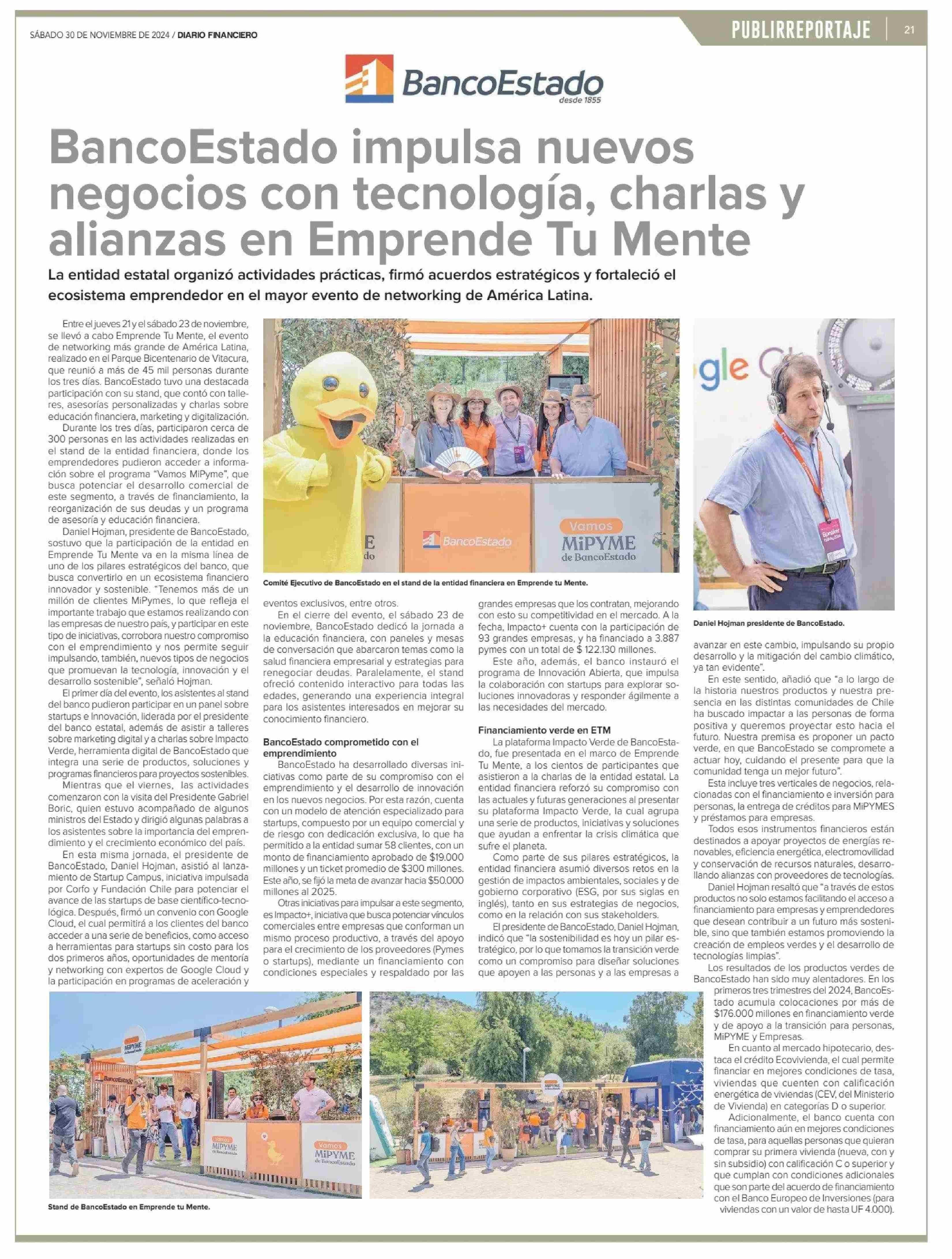 BancoEstado impulsa nuevos negocios con tecnología, charlas y alianzas en Emprende Tu Mente 30-11-2024 Diario Financiero |