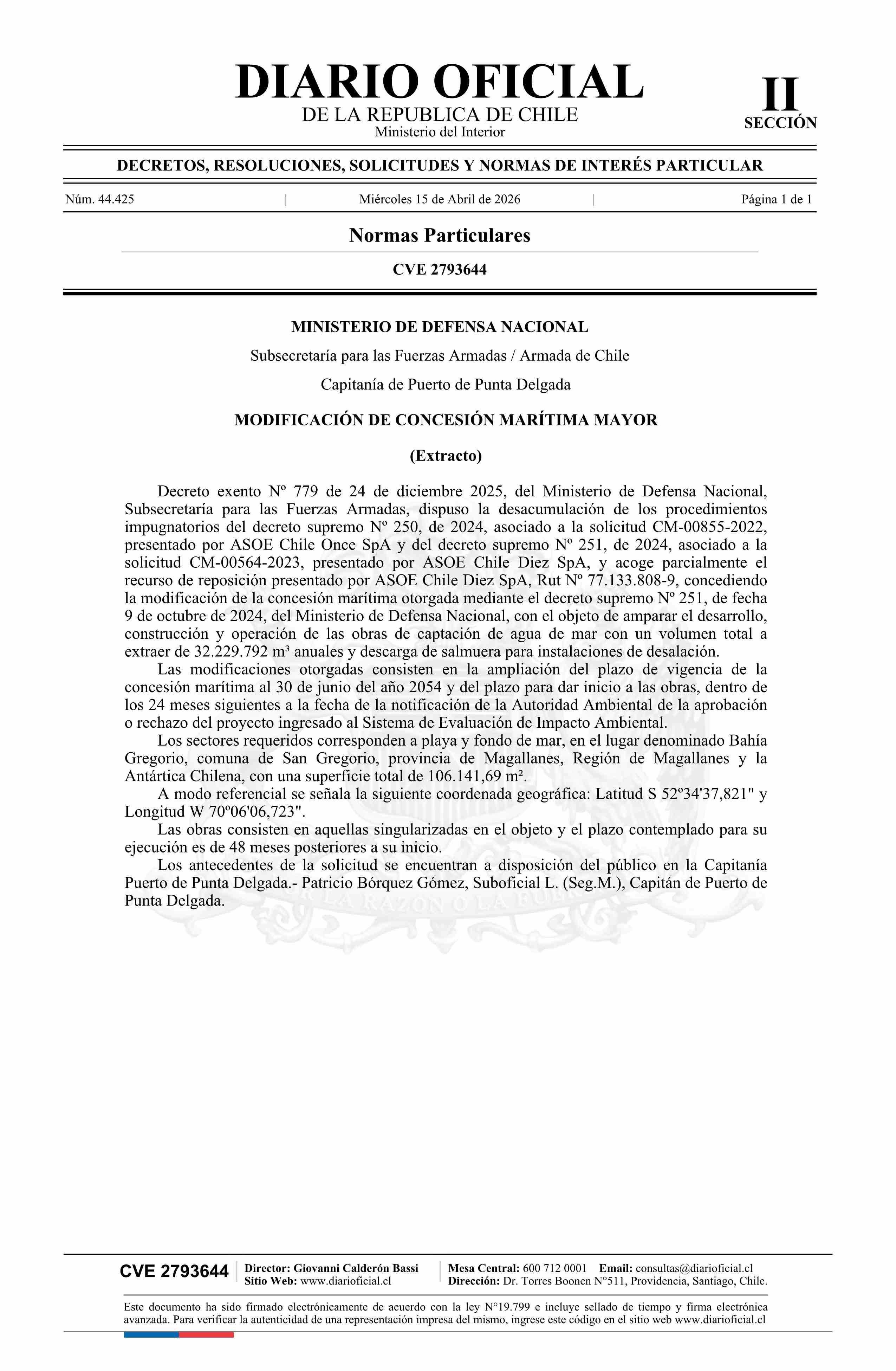 Extracto de decreto número 779, de 2025.- Modificación de concesión marítima mayor 15-04-2026 Diario Oficial Edición Electrónica |