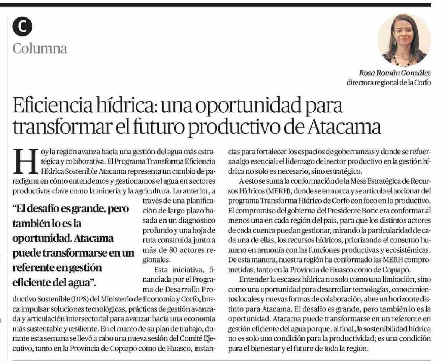 Columnas de Opinión: Eficiencia hídrica: una oportunidad para transformar el futuro productivo de Atacama 24-01-2026 El Diario de Atacama |