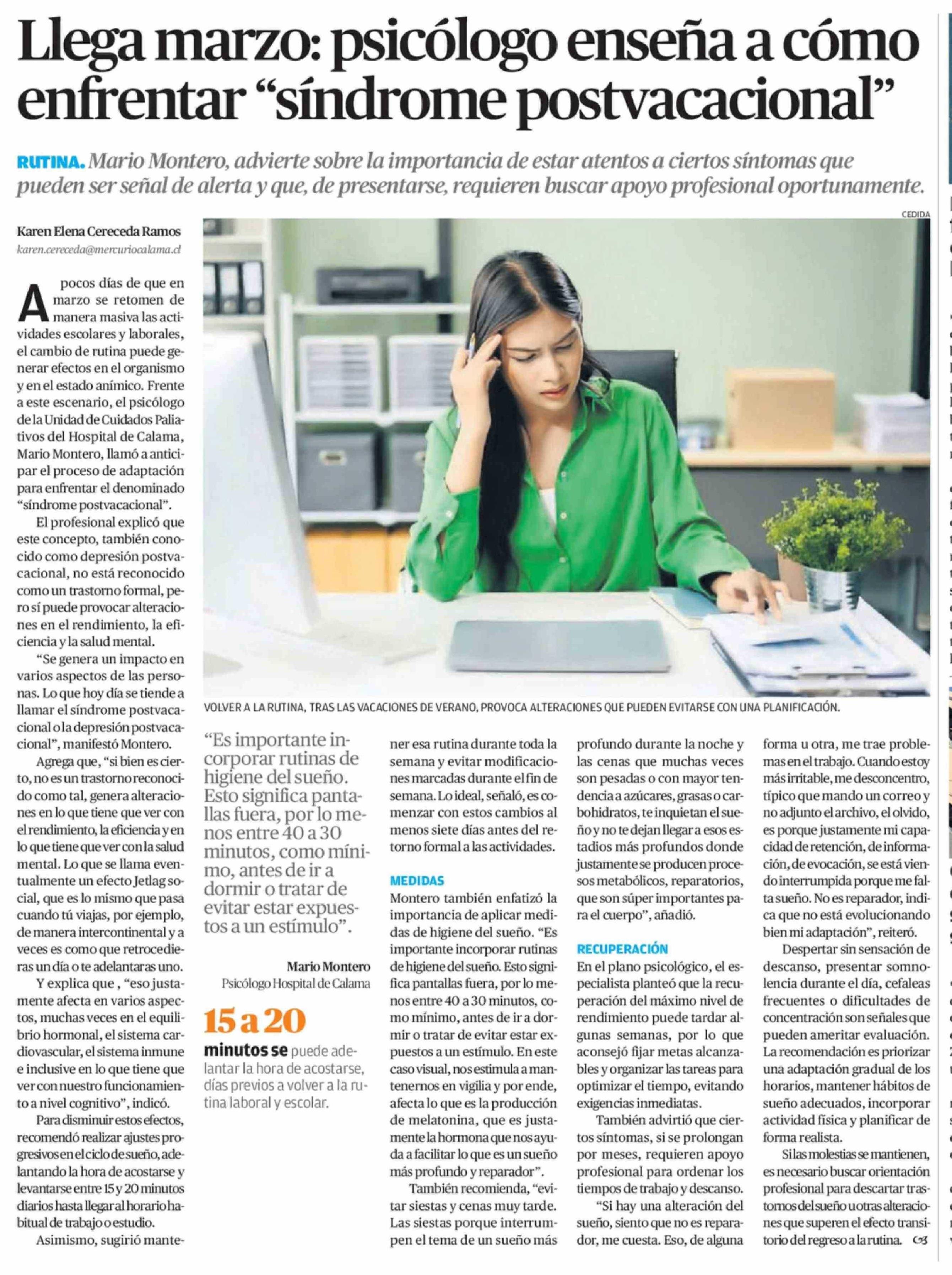 Llega marzo: psicólogo enseña a cómo enfrentar "síndrome postvacacional" 28-02-2026 El Mercurio de Antofagasta |