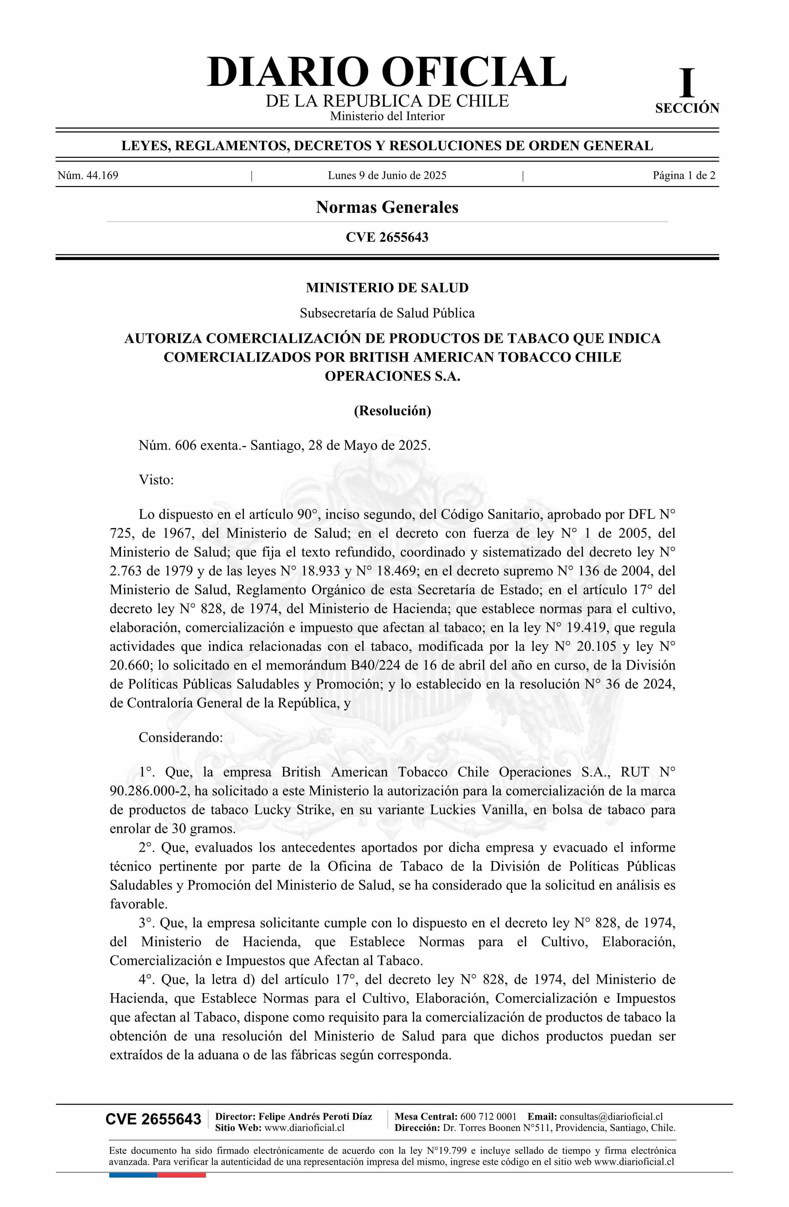 Resolución exenta número 606, de 2025.- Autoriza comercialización de productos de tabaco que indica comercializados por British American Tobacco Chile Operaciones S.A. 09-06-2025 Diario Oficial Edición Electrónica |