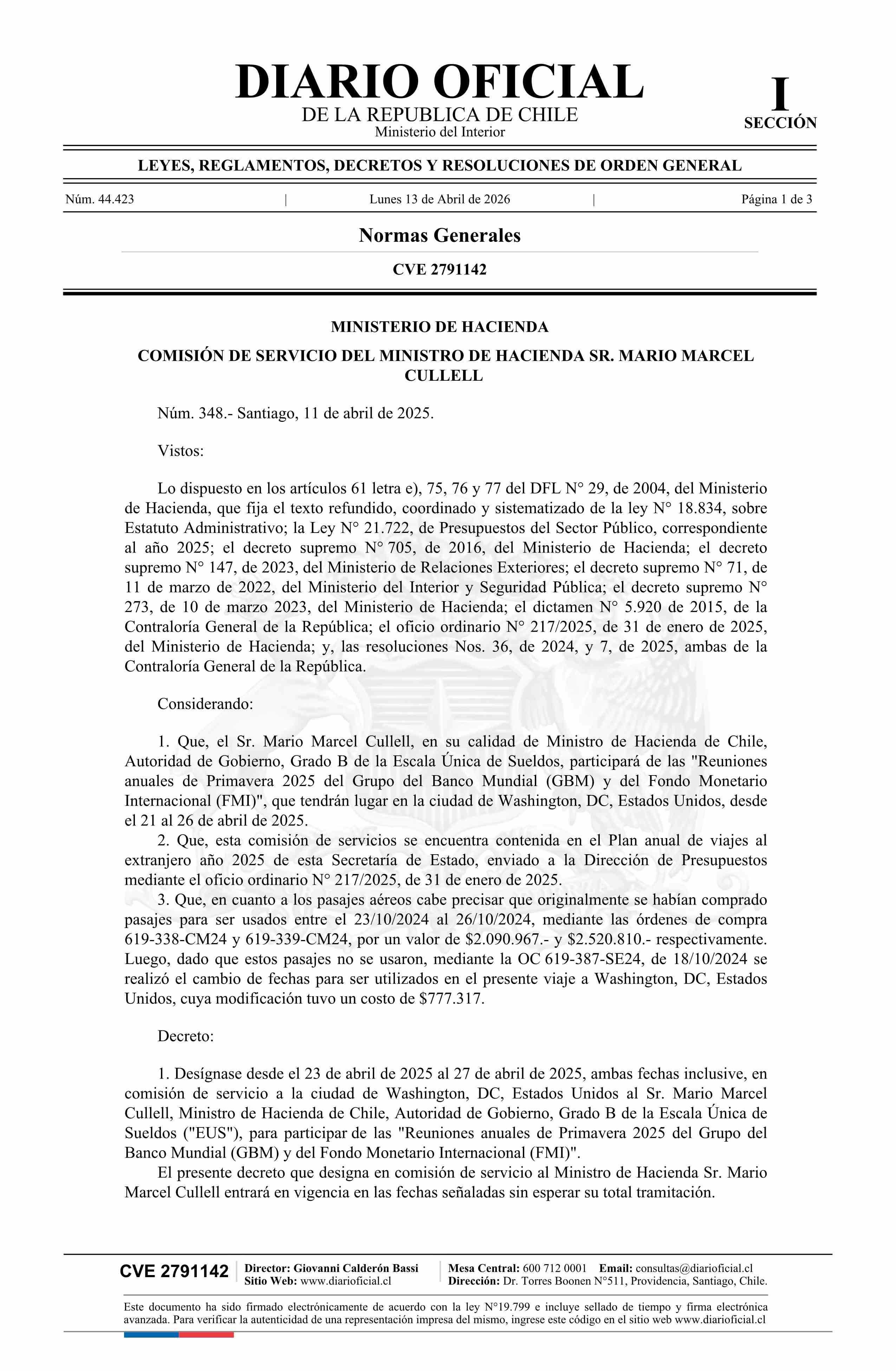 Decreto número 348, de 2025.- Designa en comisión de servicio en el extranjero a don Mario Marcel Cullell, Ministro de Hacienda, a la ciudad de Washington, Estados Unidos 13-04-2026 Diario Oficial Edición Electrónica |
