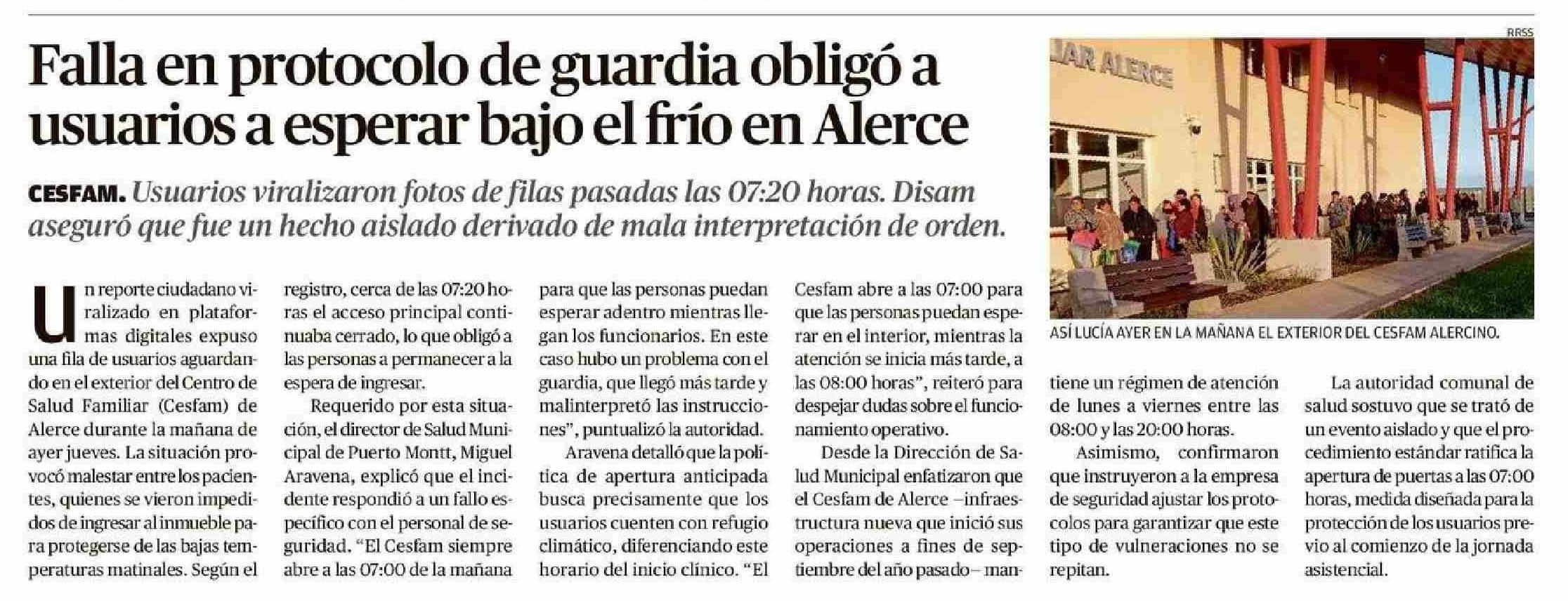 Falla en protocolo de guardia obligó a usuarios a esperar bajo el frío en Alerce 16-01-2026 El Llanquihue |