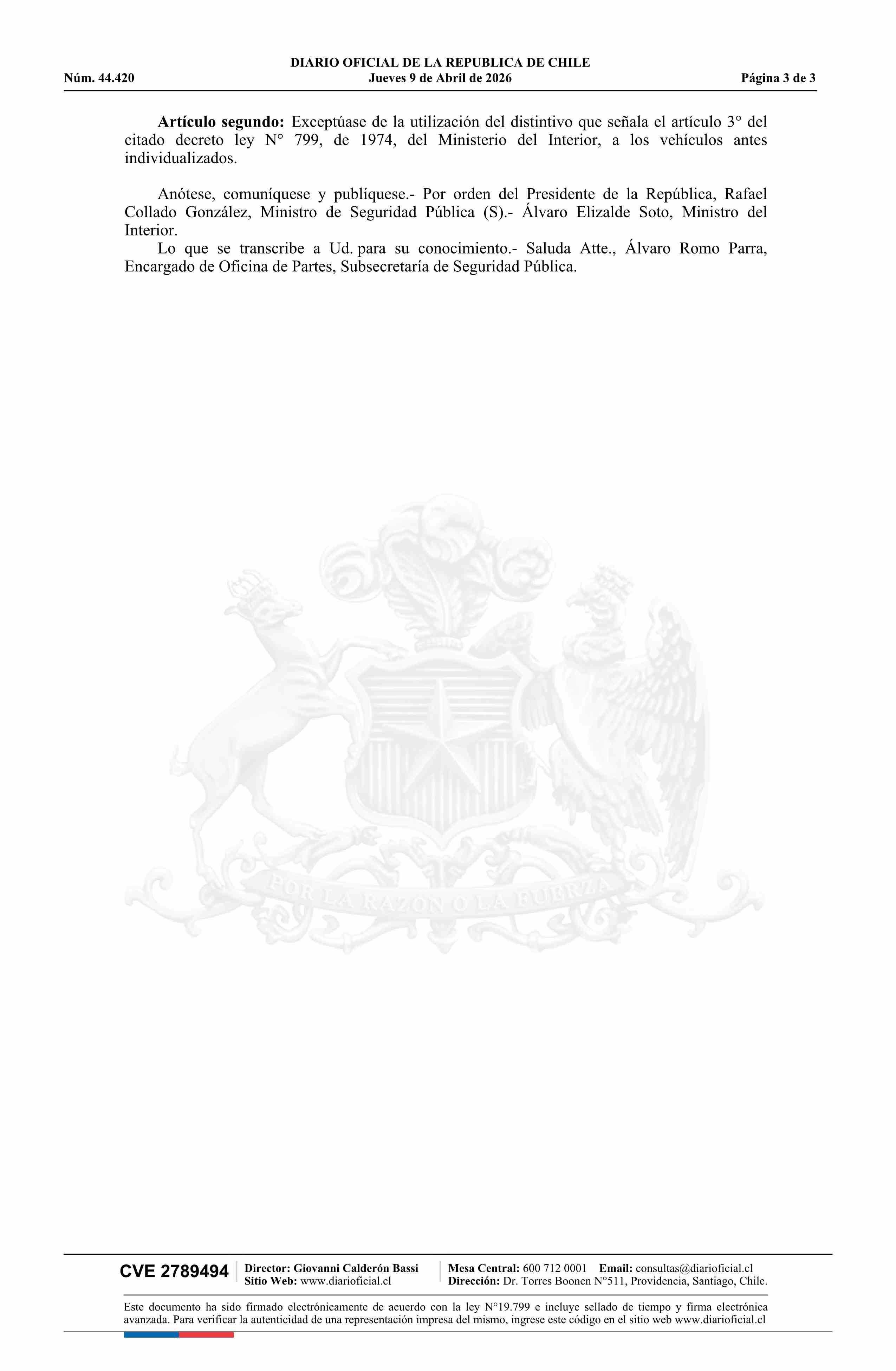 Decreto exento número 282, de 2025.- Autoriza circulación y exceptúa del uso de disco fiscal a vehículos de la Subsecretaría de Seguridad Pública, en los términos que indica 09-04-2026 Diario Oficial Edición Electrónica |