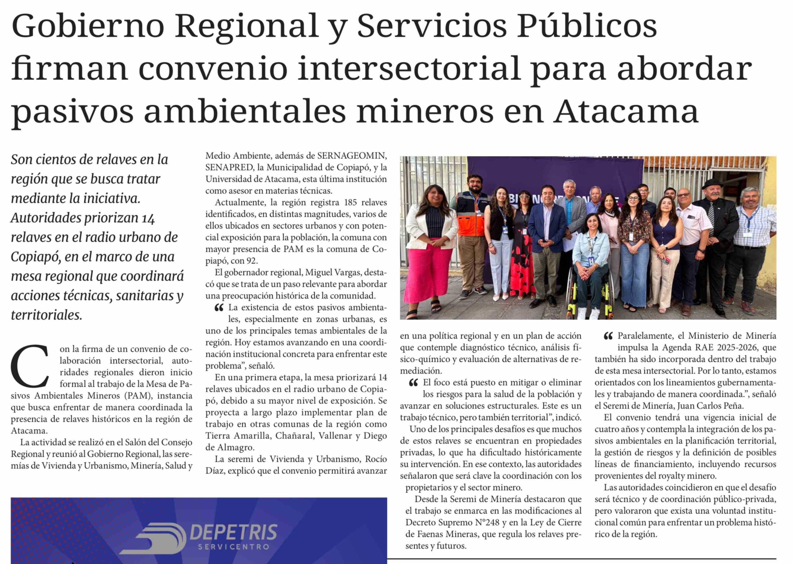 | Título: | Gobierno Regional y Servicios Públicos firman convenio intersectorial para abordar pasivos ambientales mineros en Atacama |
