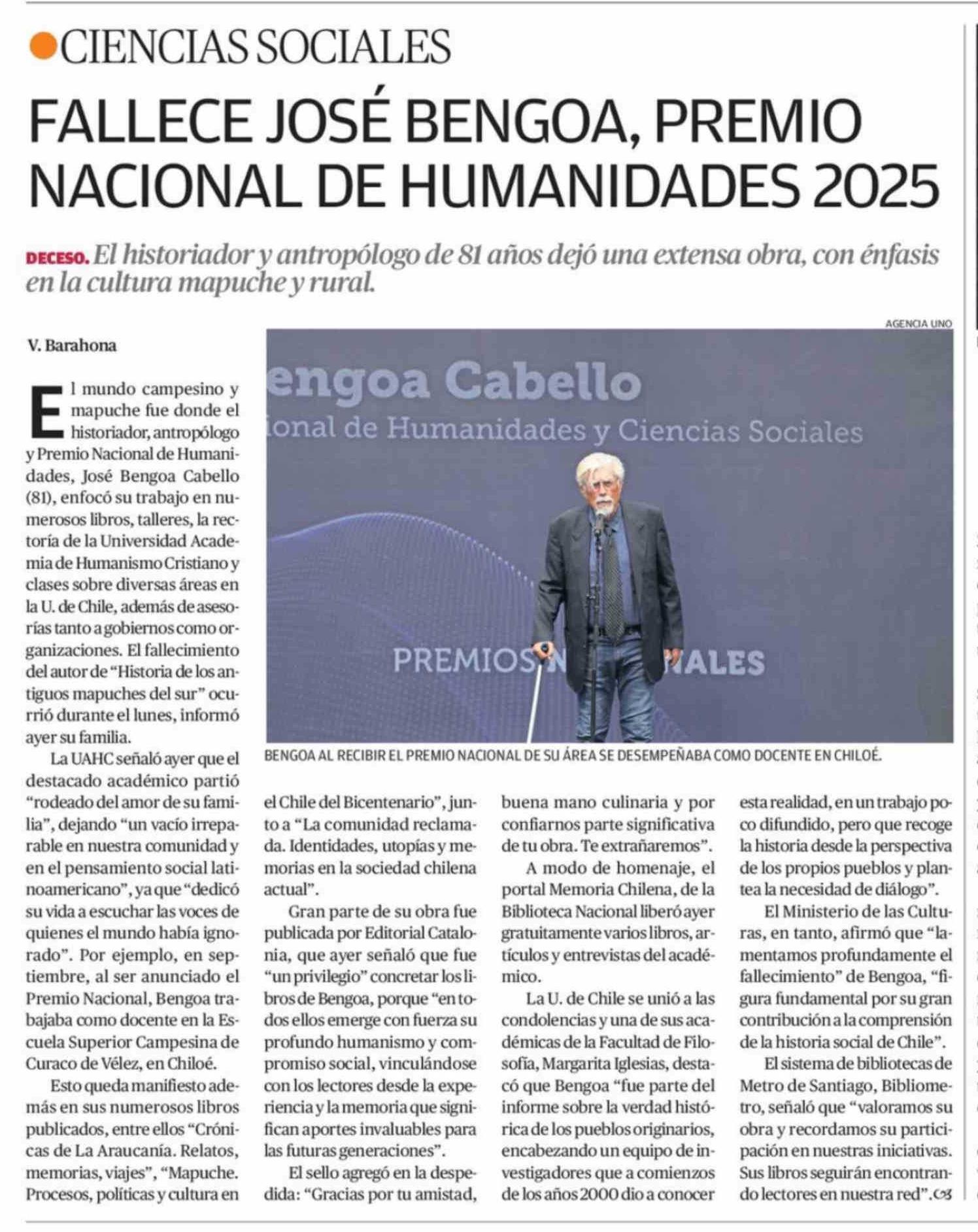 | Título: | FALLECE JOSÉ BENGOA, PREMIO NACIONAL DE HUMANIDADES 2025 |