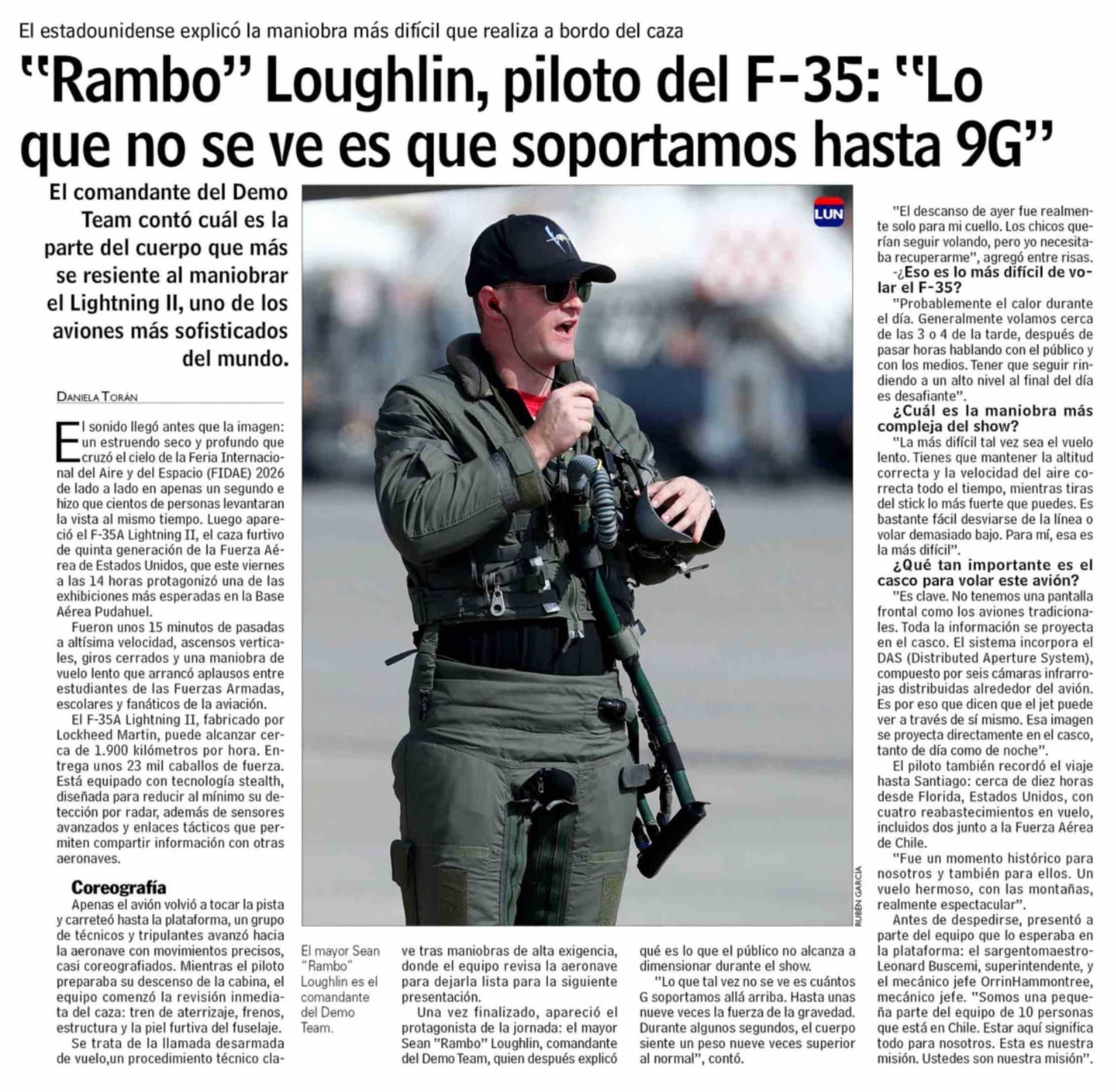 "Rambo" Loughlin, piloto del F-35: "Lo que no se ve es que soportamos hasta 9G" 11-04-2026 Las Últimas Noticias |