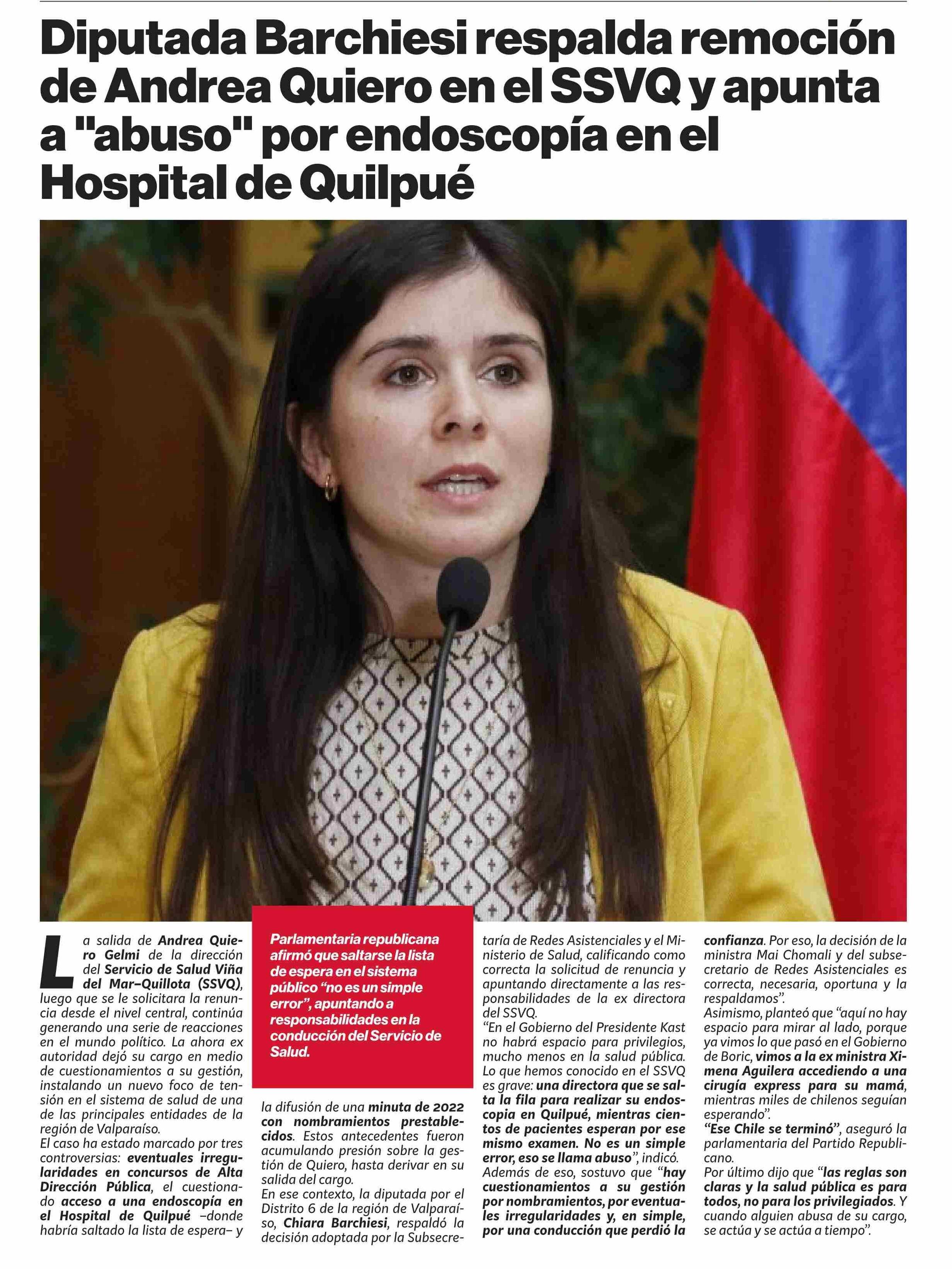Título: Diputada Barchiesi respalda remoción de Andrea Quiero en el SSVQ y apunta a"abuso” por endoscopía en el Hospital de Quilpué