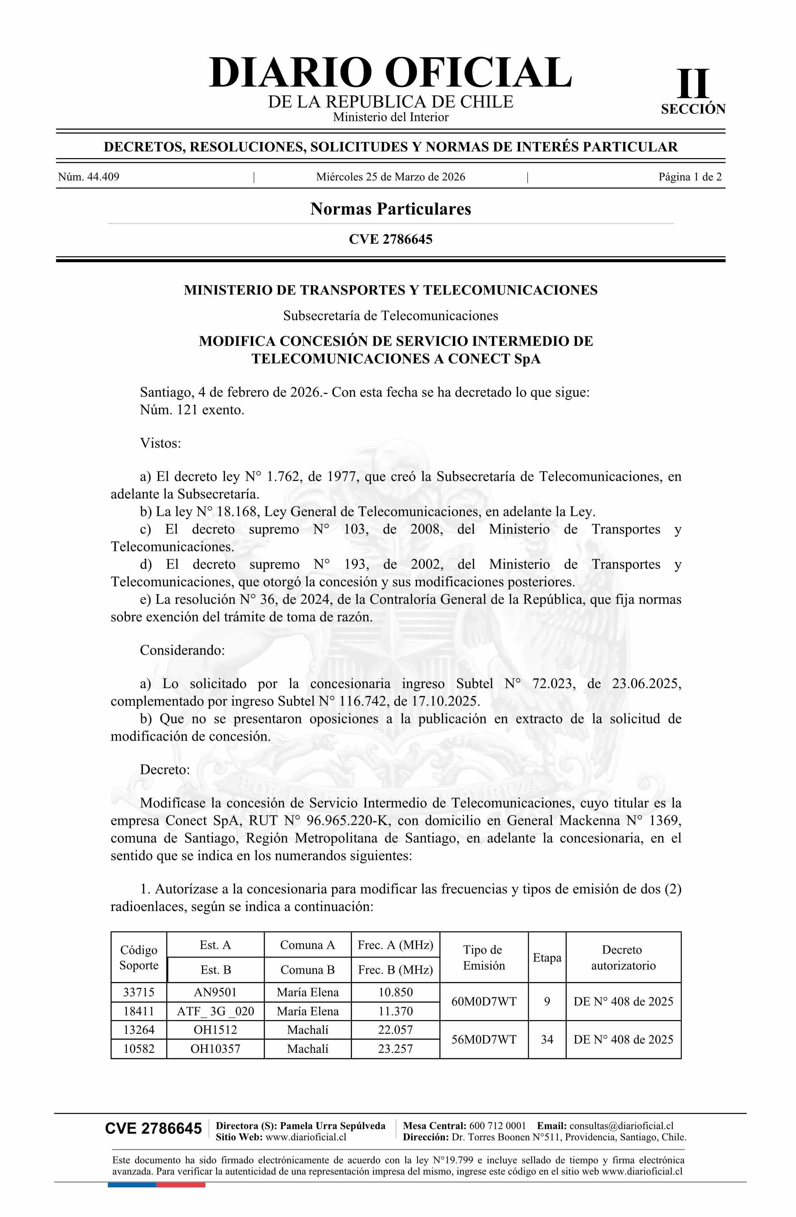 Decreto exento número 121, de 2026.- Modifica concesión de servicio intermedio de telecomunicaciones a Conect SpA 25-03-2026 Diario Oficial Edición Electrónica |