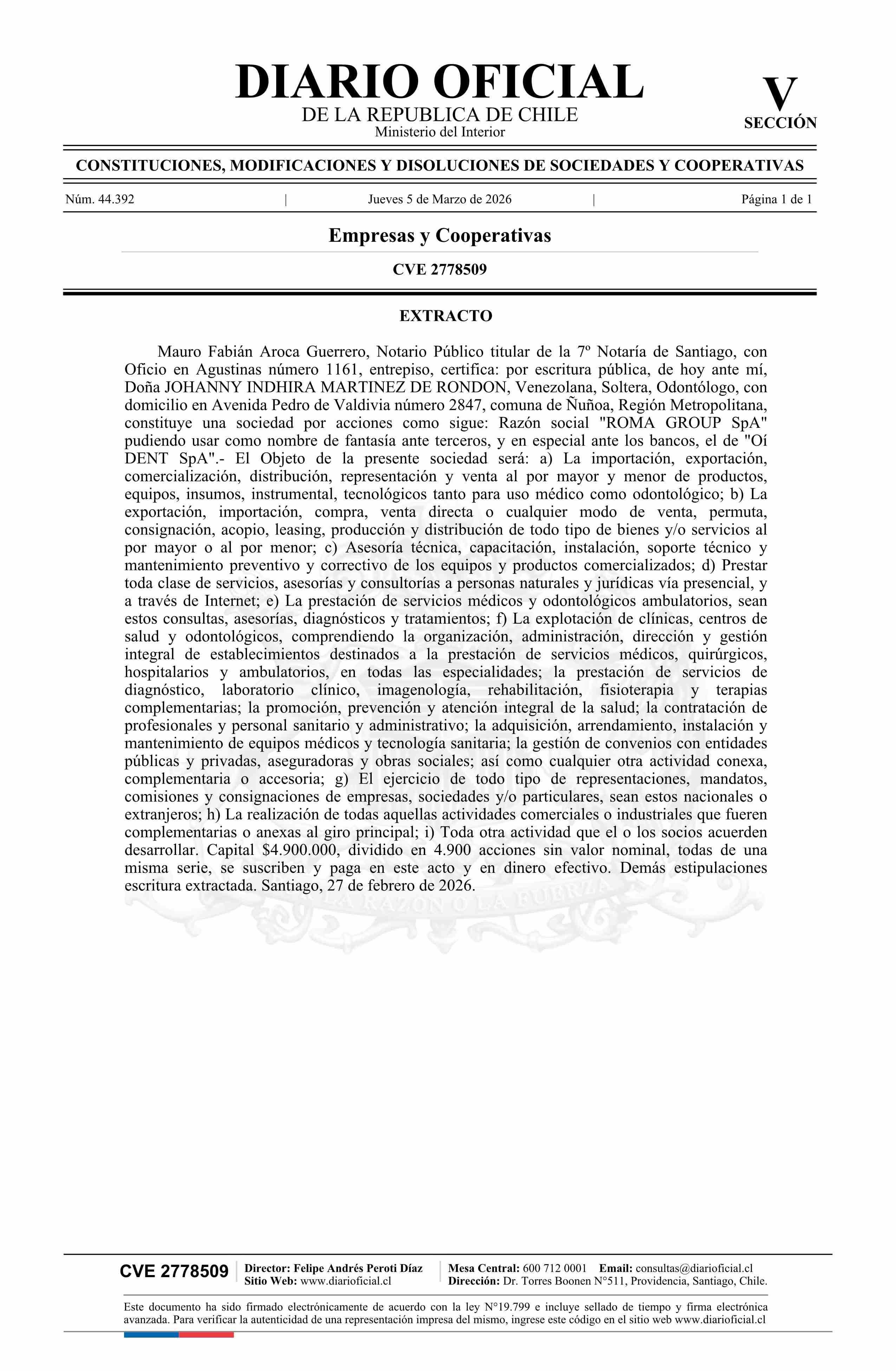 ROMA GROUP SpA 05-03-2026 Diario Oficial Edición Electrónica |