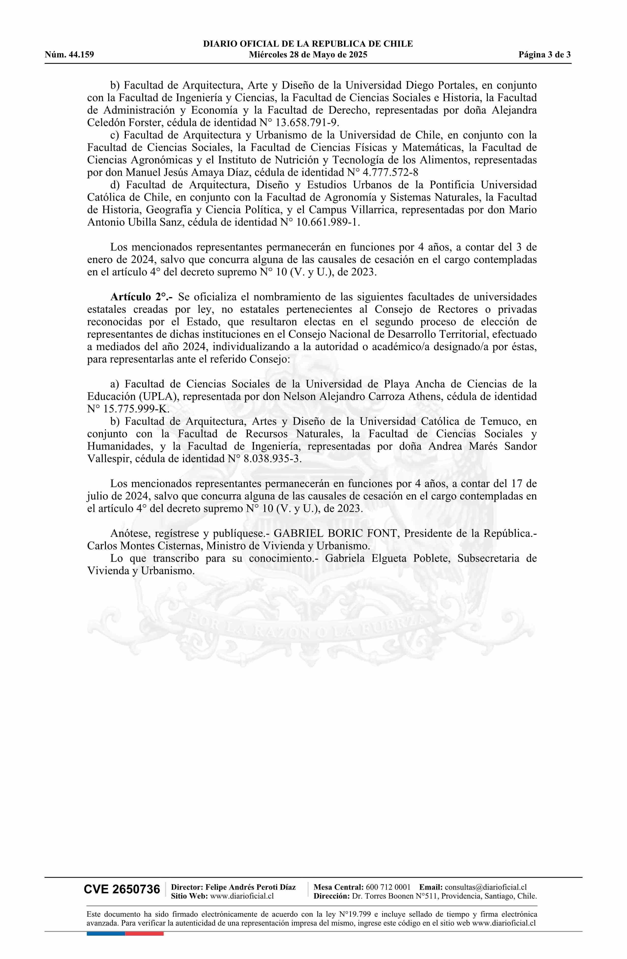Decreto exento número 81, de 2024.- Oficializa el nombramiento de seis representantes de universidades en el Consejo Nacional de Desarrollo Territorial 28-05-2025 Diario Oficial Edición Electrónica |