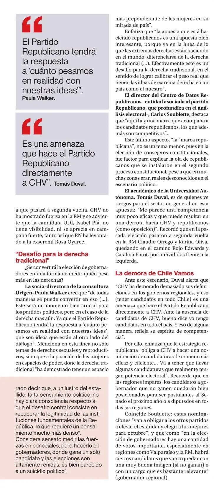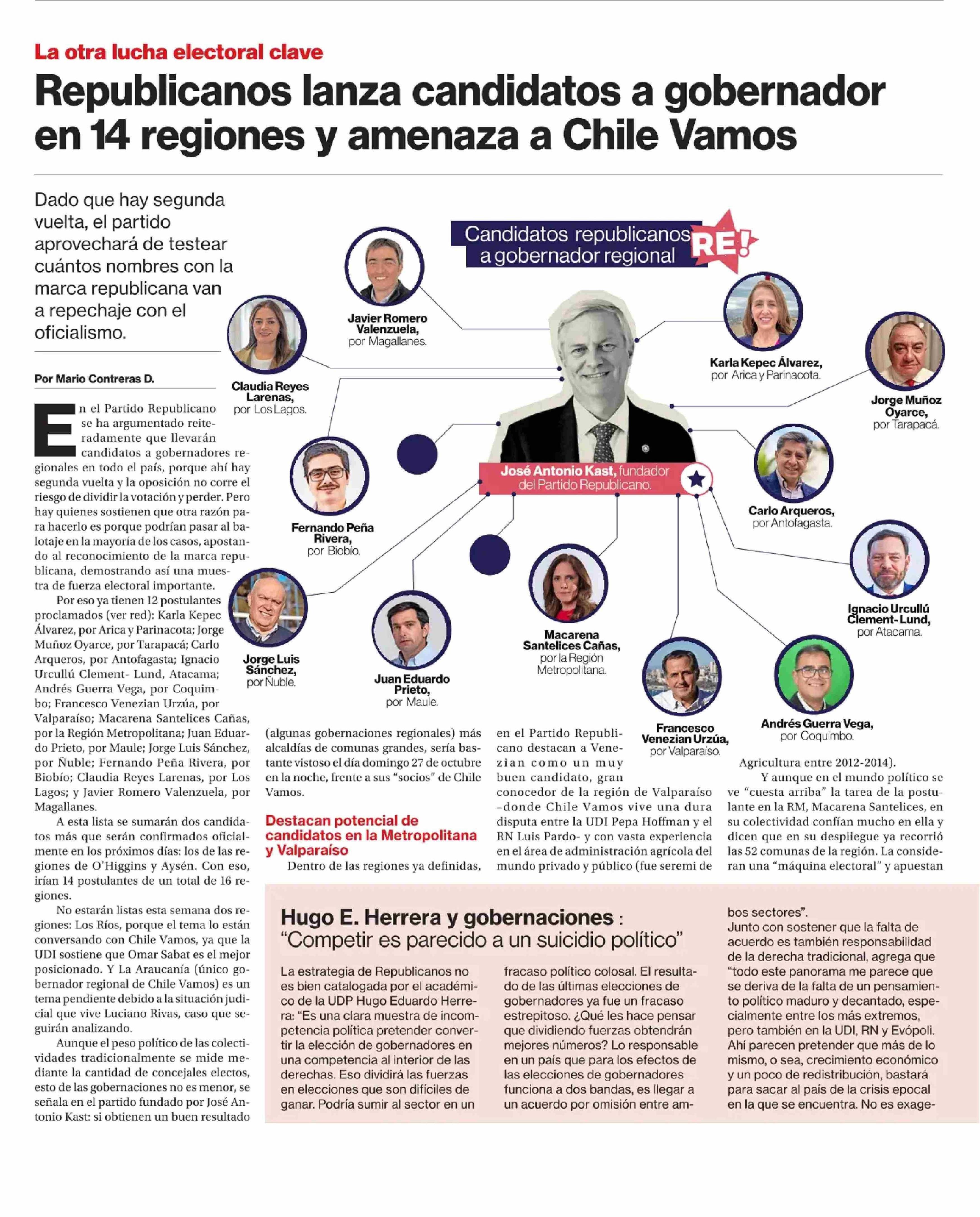 Republicanos lanza candidatos a gobernador en 14 regiones y amenaza a Chile Vamos 06-06-2024 La Segunda |