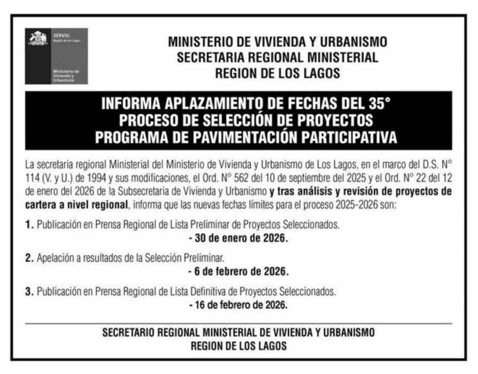 | Título: | Extractos: MINISTERIO DE VIVIENDA Y URBANISMO SECRETARIA REGIONAL MINISTERIAL REGION DE LOS LAGOS INFORMA APLAZAMIENTO DE FECHAS DEL 35° PROCESO DE SELECCIÓN DE PROYECTOS PROGRAMA DE PAVIMENTACIÓN PARTICIPATIVA |