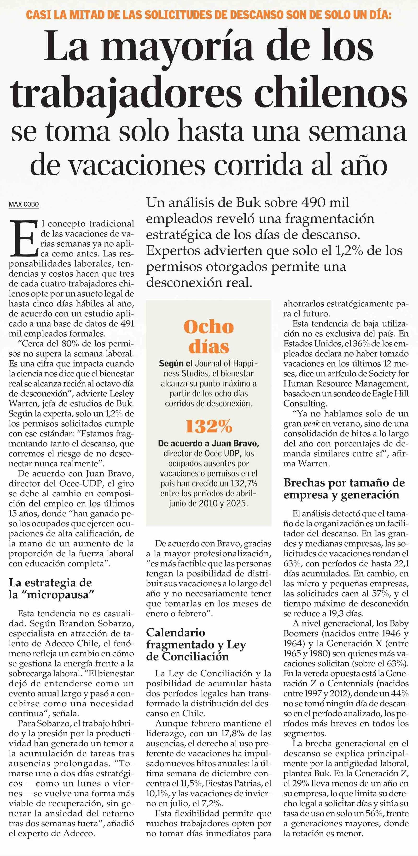 Título: La mayoría de los trabajadores chilenos se toma solo hasta una semana de vacaciones corrida al año