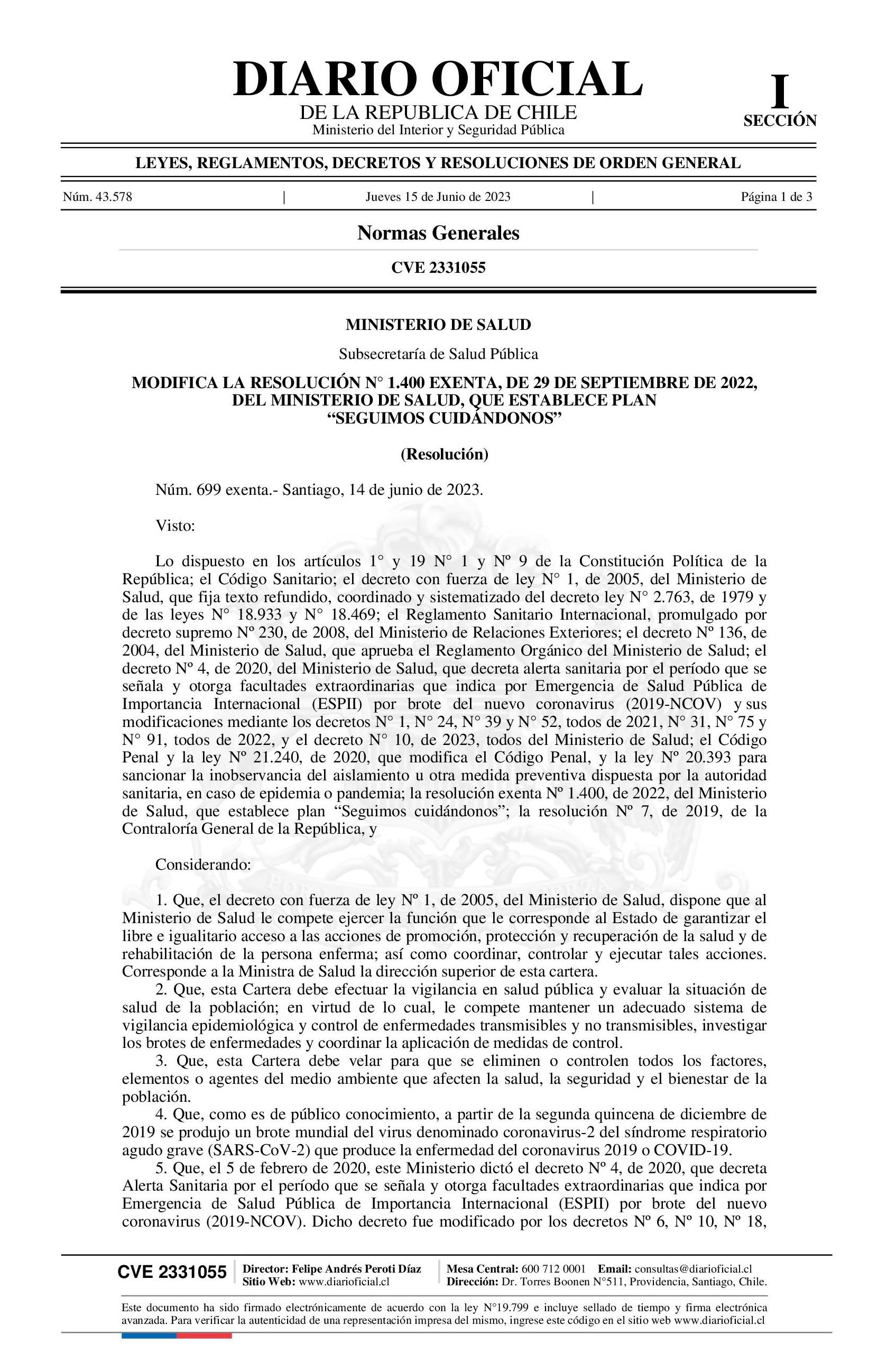 Ministerio de Salud Modifica la Resolución N° 1.400 Exenta, de 29 de Septiembre de 2022, Del Ministerio de Salud, Que Establece Plan “seguimos Cuidándonos” 15-06-2023 Diario Oficial Edición Electrónica |