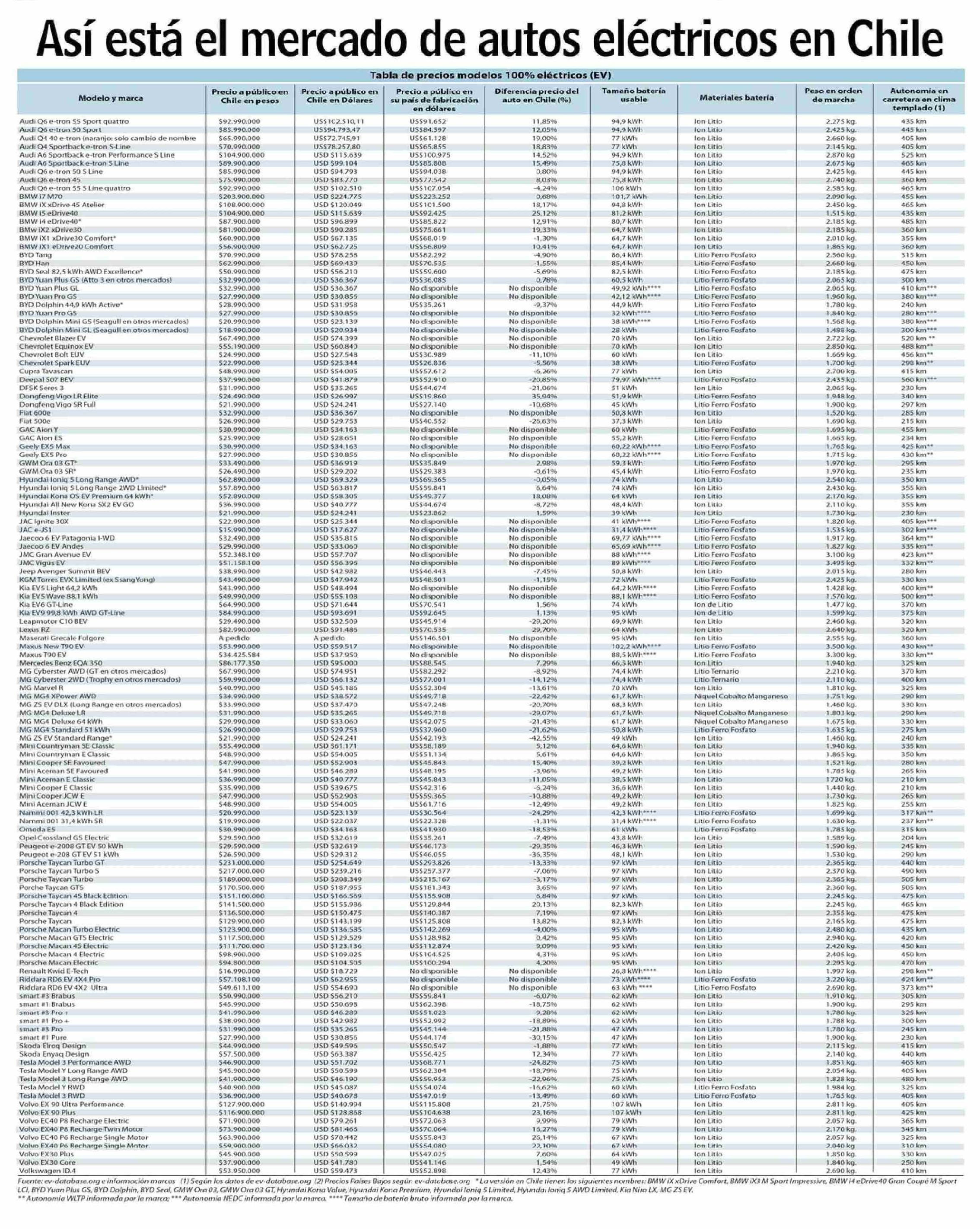 Título: Así está el mercado de autos eléctricos en Chile Tabla de precios modelos 100% eléctricos (EV) Diferencia precio del Tamaño batería Autonomía en Precio a público en Precio a público en Precio a público en Peso en orden Chile en Dólares usable de marcha carretera en clima Chile en pesos su país de fa
